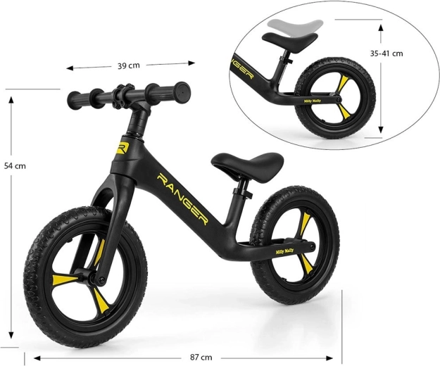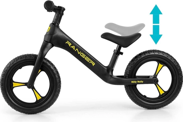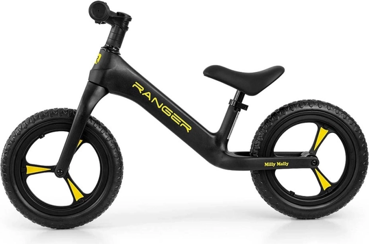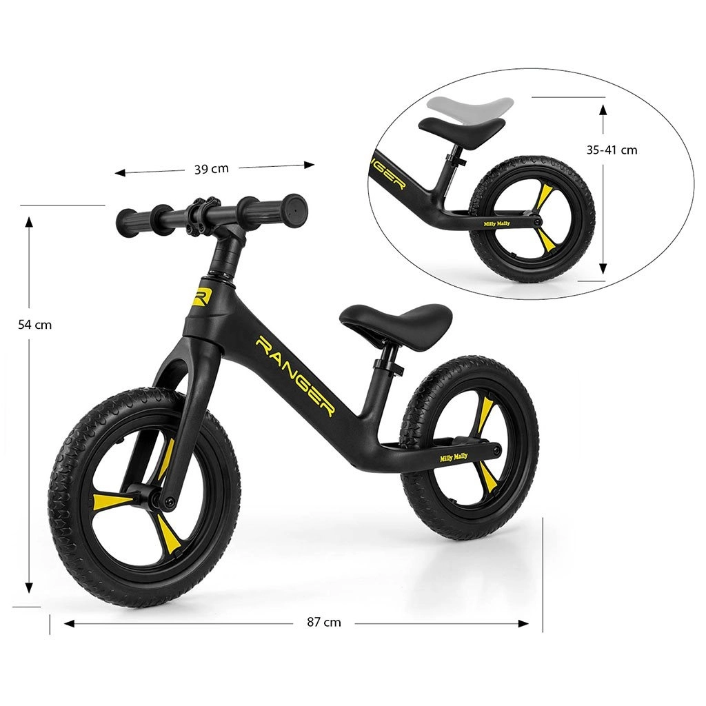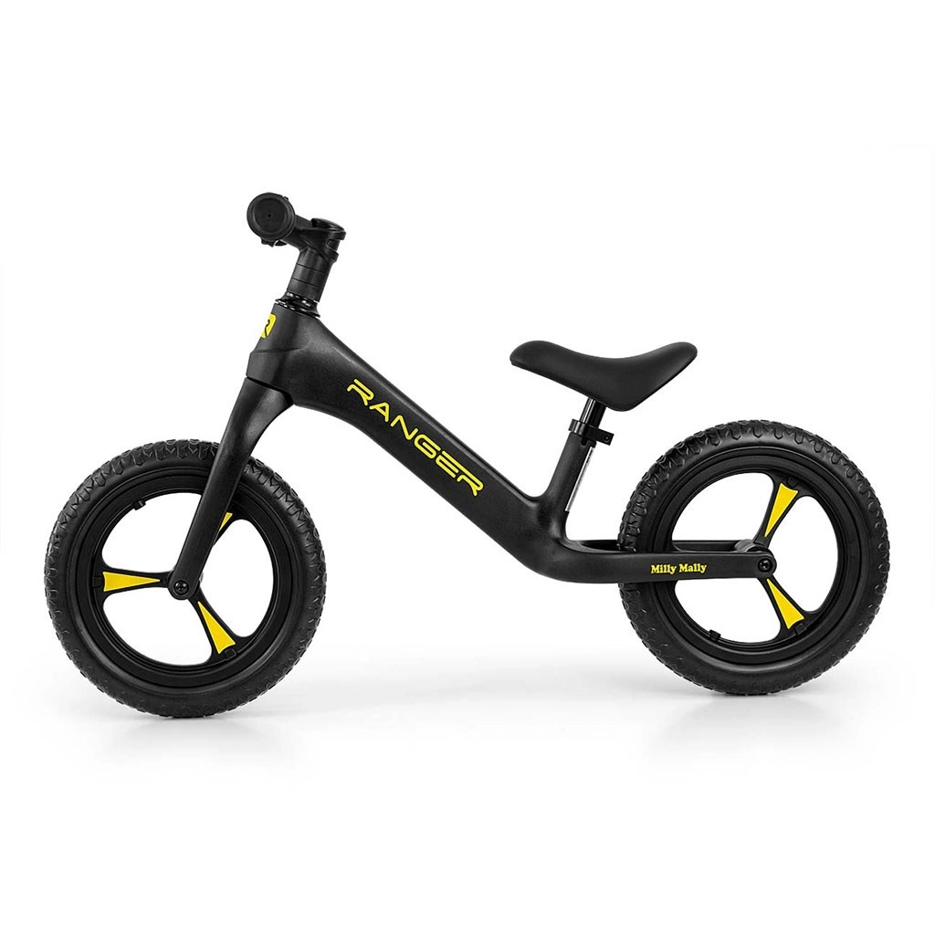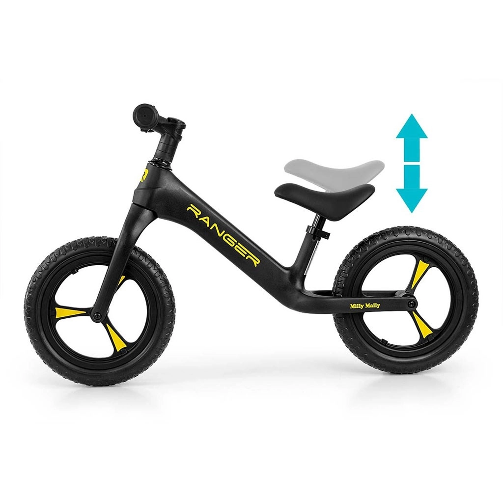 La leggera bicicletta senza pedali per bambini MILLY MALLY Ranger in elegante colore nero aiuta a sviluppare l’equilibrio e la sicurezza nelle prime pedalate. Grazie al telaio composito estremamente leggero, alle ruote EVA da 12" esenti da manutenzione resistenti alle forature e alla sella regolabile in altezza, i bambini godranno di una guida comoda e sicura. Cuscinetti a sfera nelle ruote e nel manubrio e manopole antiscivolo garantiscono controllo fluido e stabilità.