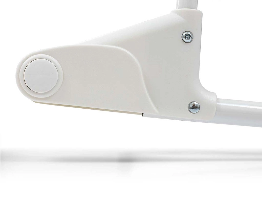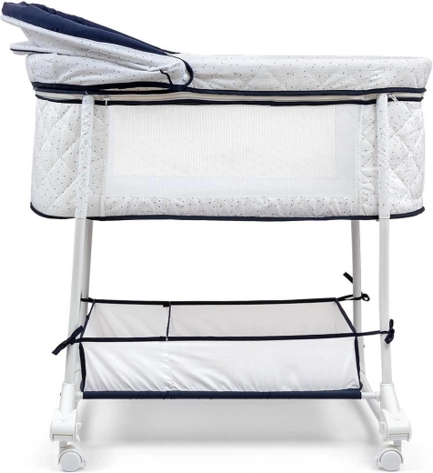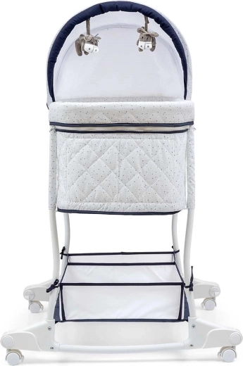 La pratica capottina removibile e ribaltabile con due morbidi giochi in peluche protegge dalla luce e offre stimoli visivi. Il materasso morbido e il rivestimento interno trapuntato garantiscono il massimo comfort, mentre il cesto inferiore con due scomparti accoglie tutto il necessario. Il telaio in metallo, le ruote bloccabili e i piedini antiscivolo offrono stabilità e facilitano gli spostamenti in casa.