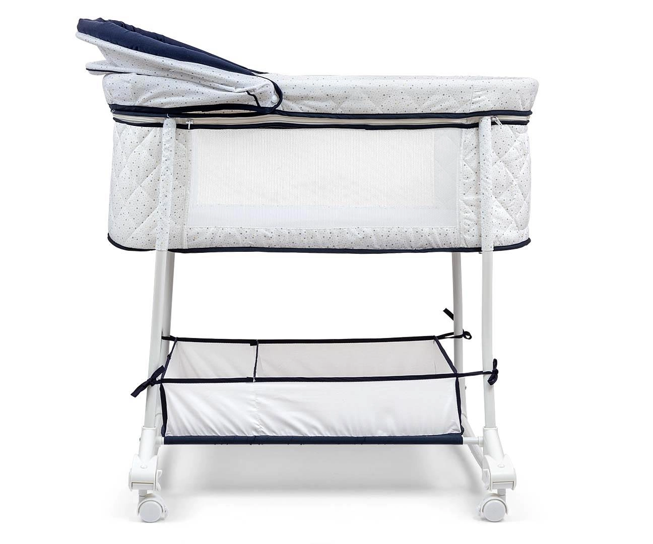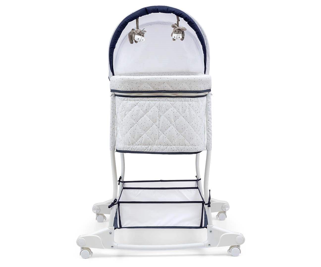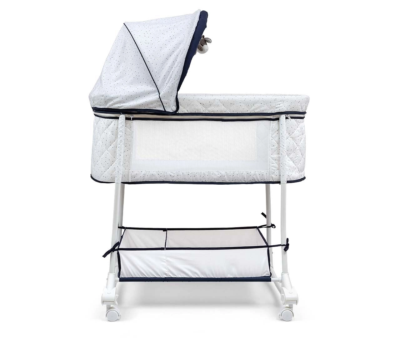 Materasso morbido, capottina removibile/ribaltabile con giochini in peluche e cesto inferiore con 2 scomparti per tutti gli indispensabili.