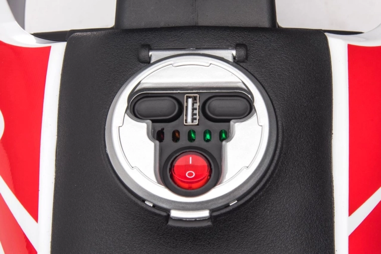 La moto è dotata di un moderno pannello audio con MP3, USB, Bluetooth e melodie integrate: la musica preferita sarà sempre a portata di mano durante il tragitto. La potente trazione 2x35 W alimentata da batteria 12 V 7 Ah offre forza sufficiente anche per girare in giardino. I fari anteriori a LED aumentano la visibilità e donano un look accattivante.