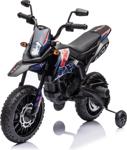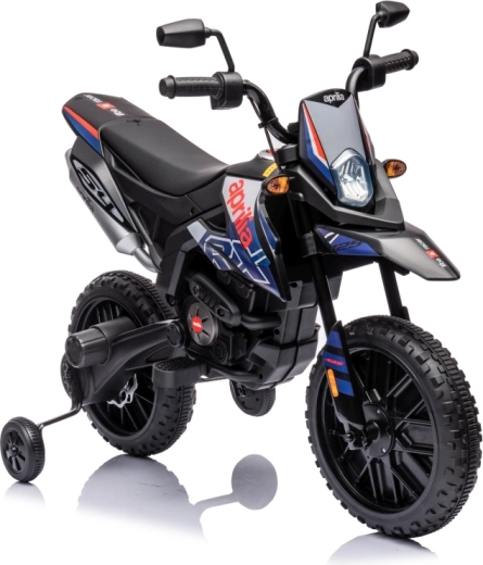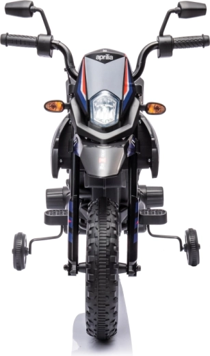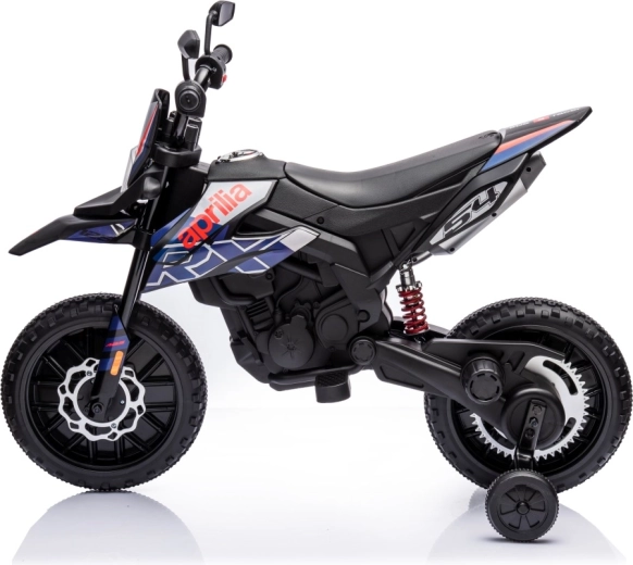 La moto elettrica per bambini APRILIA RX in colore blu combina un design realistico da fuoristrada con funzioni sicure per i piloti alle prime armi. Due motori da 35 W e una batteria da 12 V / 7 Ah assicurano partenze progressive e potenza sufficiente, mentre le rotelle laterali aiutano a mantenere la stabilità.