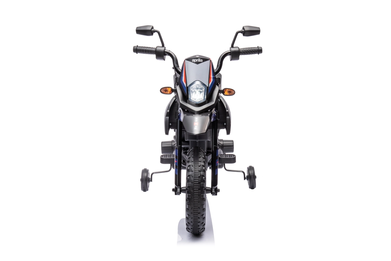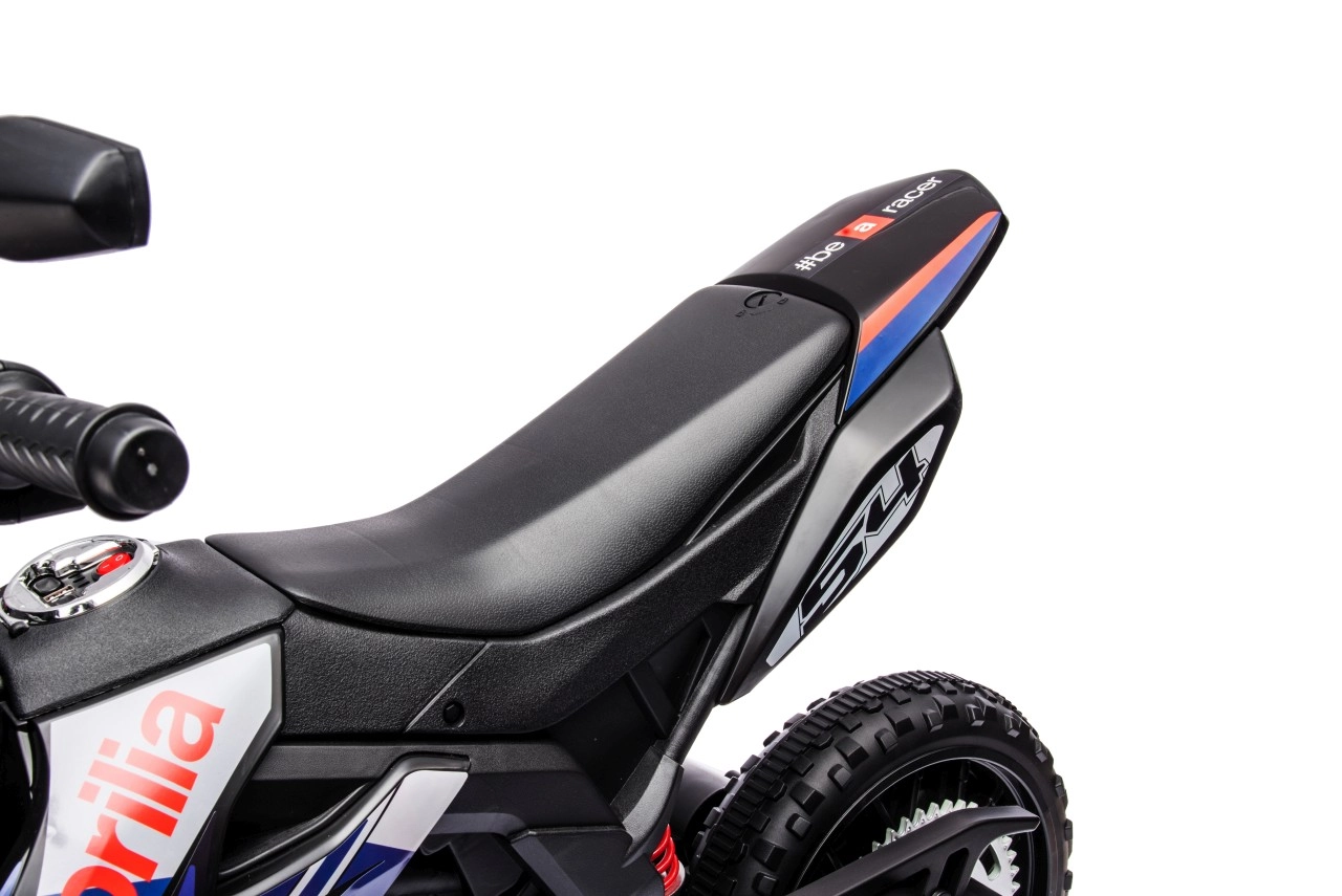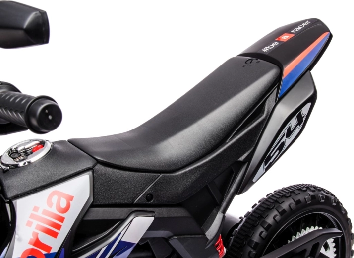 Elegante moto per bambini APRIA RX con batteria 12 V, dotata di potente trazione 2×35 W, ruote silenziose in EVA, rotelle laterali stabilizzatrici e luci anteriori a LED. Per un viaggio ancora più divertente include pannello audio con MP3/USB/Bluetooth e comoda sella in ecopelle. Ideale per i piccoli piloti che vogliono allenare l’equilibrio in sicurezza e godersi un look off‑road.