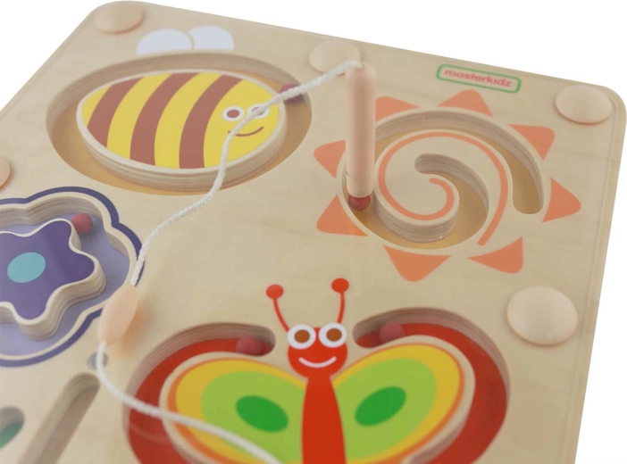 La tavola attiva in legno con labirinto magnetico è progettata per esercitare in modo divertente la precisione dei movimenti e la concentrazione. Con il “magico” stilo magnetico incluso, i bambini spostano le biglie lungo i percorsi fresati e osservano le illustrazioni colorate di insetti, fiori e sole. Così allenano in modo naturale la motricità fine, la coordinazione mano-occhio e il ragionamento logico.