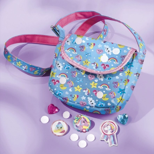 - Perline, ciondolo unicorno, bottoni 3D, 4 adesivi a strappo, gemme a forma di cuore, borsetta in tessuto