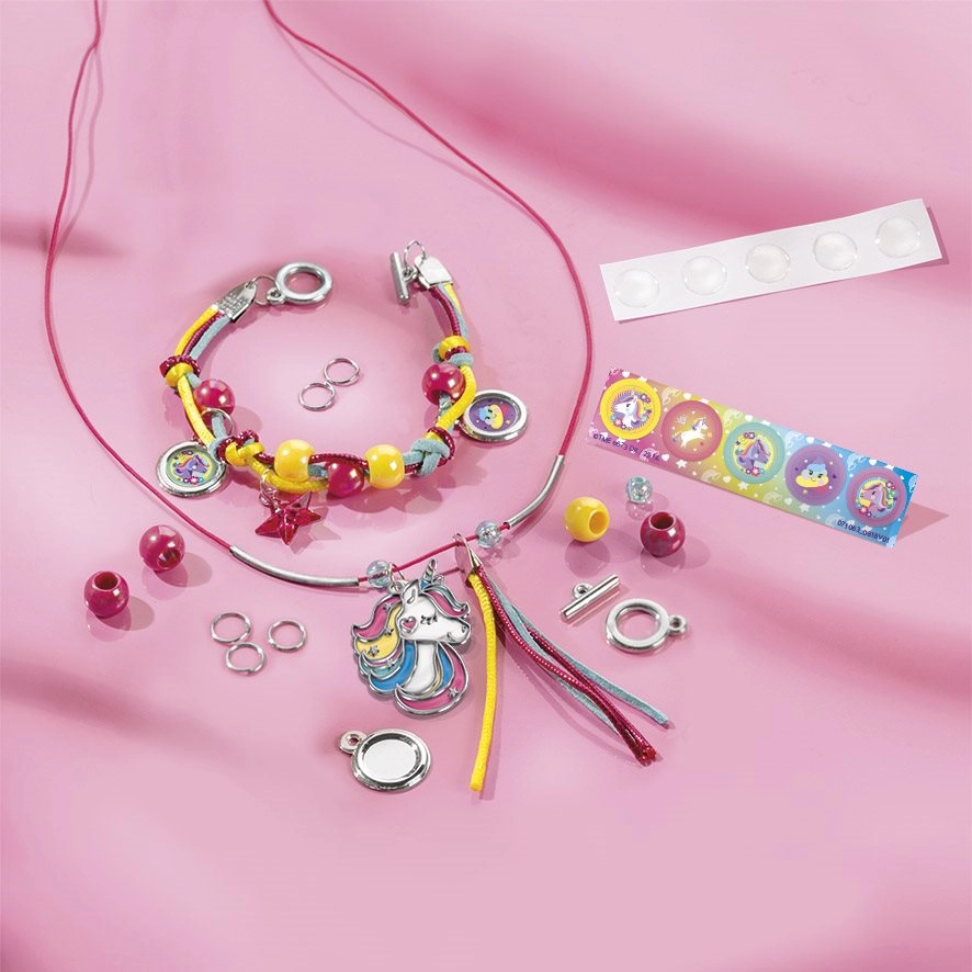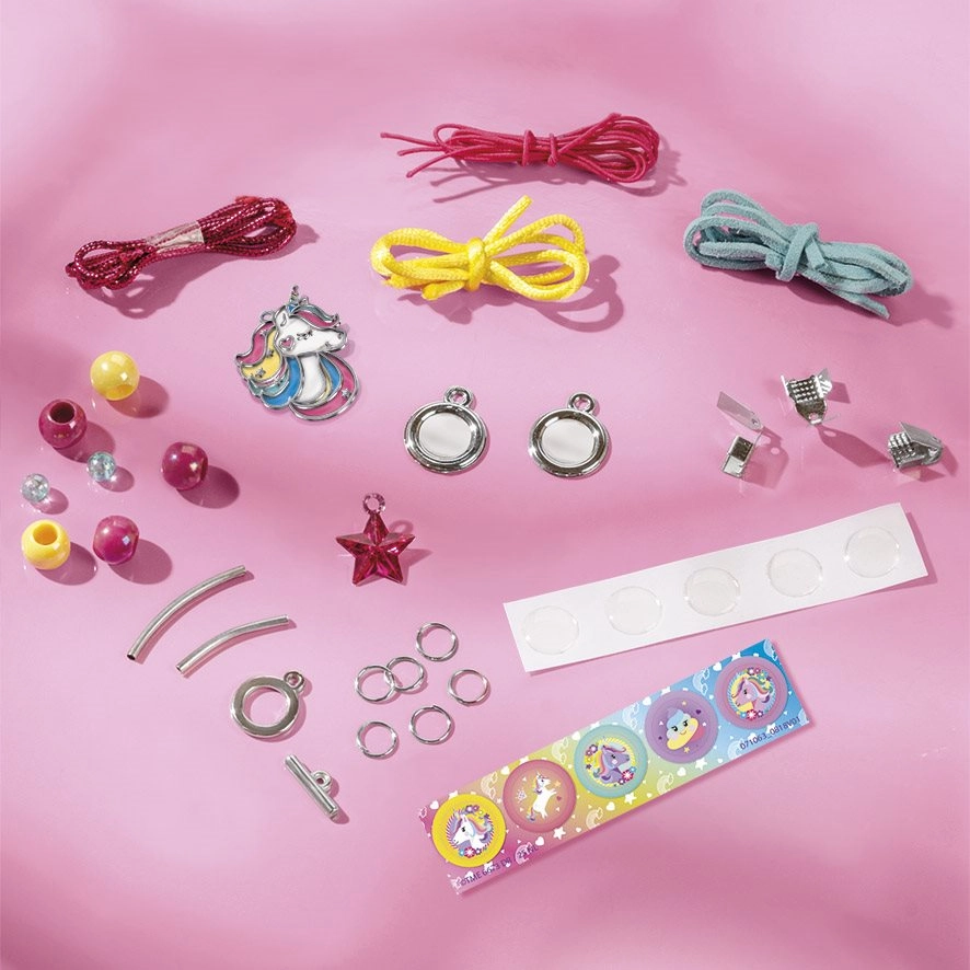 Questo magico set creativo offre un doppio divertimento: creazione di gioielli e decorazione della borsetta. I bambini realizzeranno facilmente un braccialetto e una collana con perline e ciondolo a unicorno e in seguito decoreranno la borsetta in tessuto con bottoni 3D, adesivi a strappo e brillantini a forma di cuore.