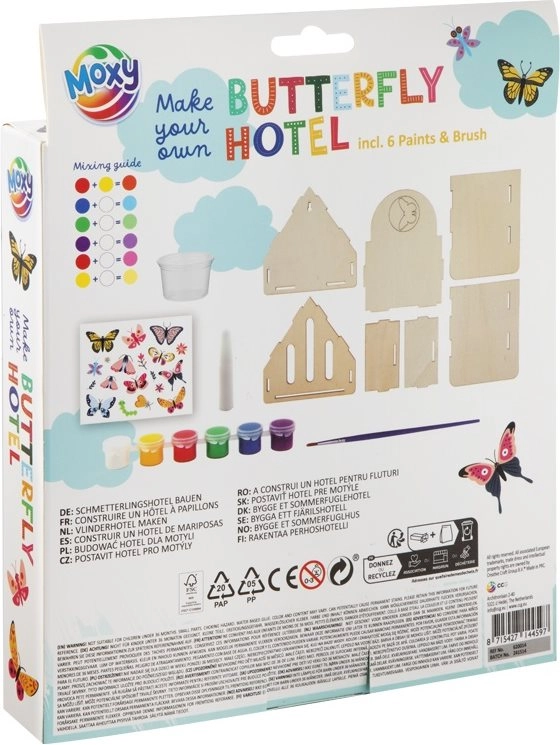Scopri la gioia del fai da te e aiuta le farfalle nel tuo giardino. Il set MOXY hotel in legno per farfalle permette a bambini e adulti di assemblare e dipingere la propria casetta in leggera balsa. Grazie ai colori acrilici inclusi, puoi creare un design unico che si integra perfettamente con l’esterno.
