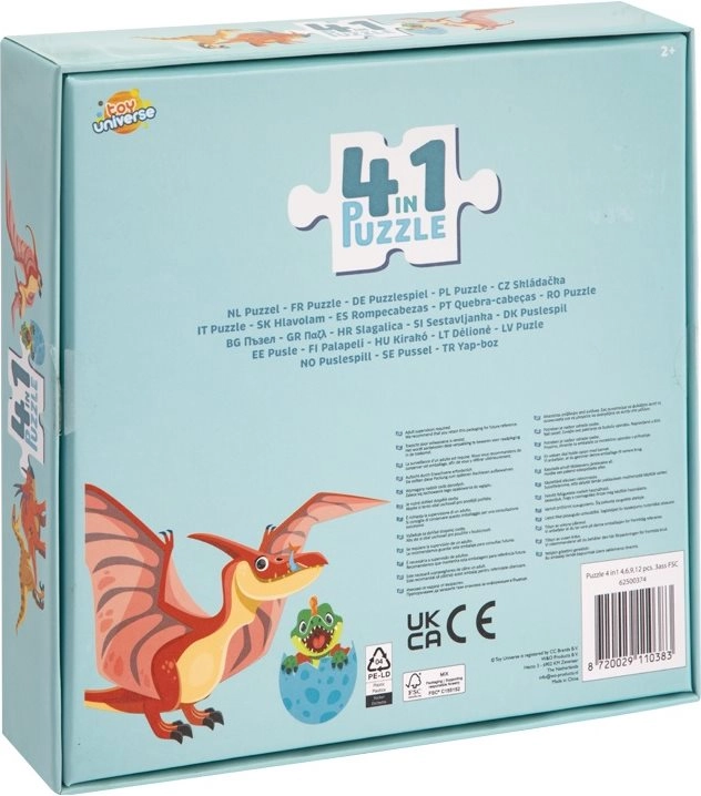 Scopri i divertenti ed educativi puzzle progressivi 4in1 a tema dinosauri di TOY UNIVERSE. Quattro puzzle da 4, 6, 9 e 12 pezzi con difficoltà crescente sviluppano motricità fine, pensiero logico e pazienza nei bambini. Ogni puzzle completato ha dimensioni compatte di circa 17,4 × 17,4 cm.