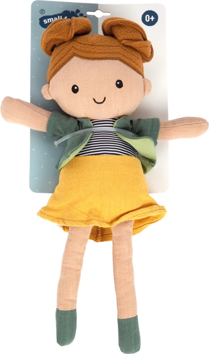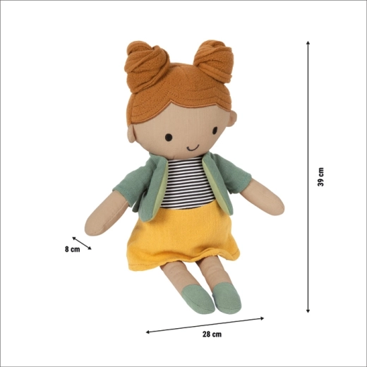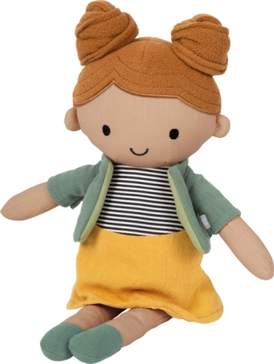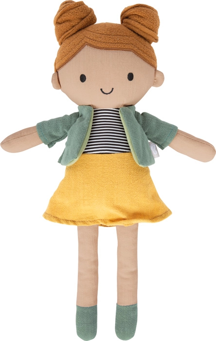 Mája indossa una gonna gialla, un top a righe e un golfino/giacchina verde che si possono mettere e togliere con facilità. Questo allena in modo naturale la motricità fine e l’autonomia. La bambola è lavabile a mano, così mantiene forma, pulizia e una lunga durata.