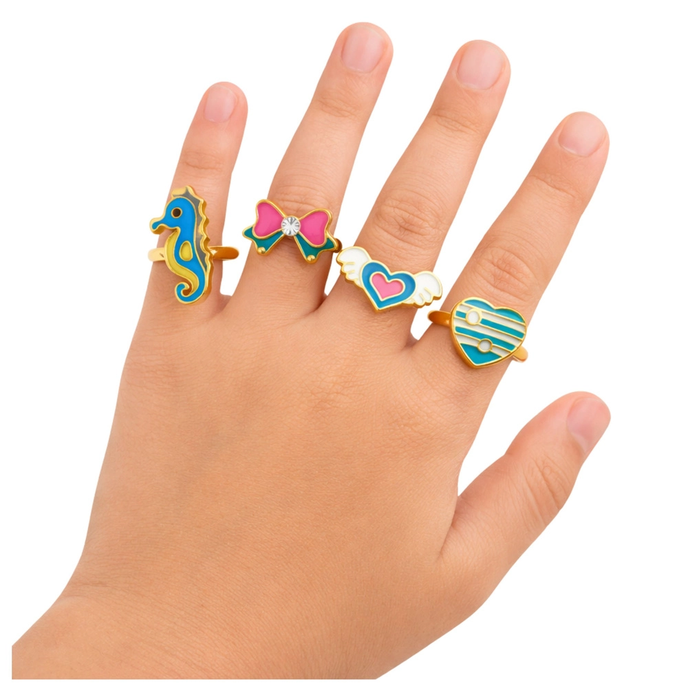 Ogni pezzo si distingue per una decorazione diversa – da fiori e animaletti a cuoricini e forme ornamentali. Grazie alla varietà dei motivi, i bambini possono abbinare gli anellini all’outfit e condividerli con le amiche.