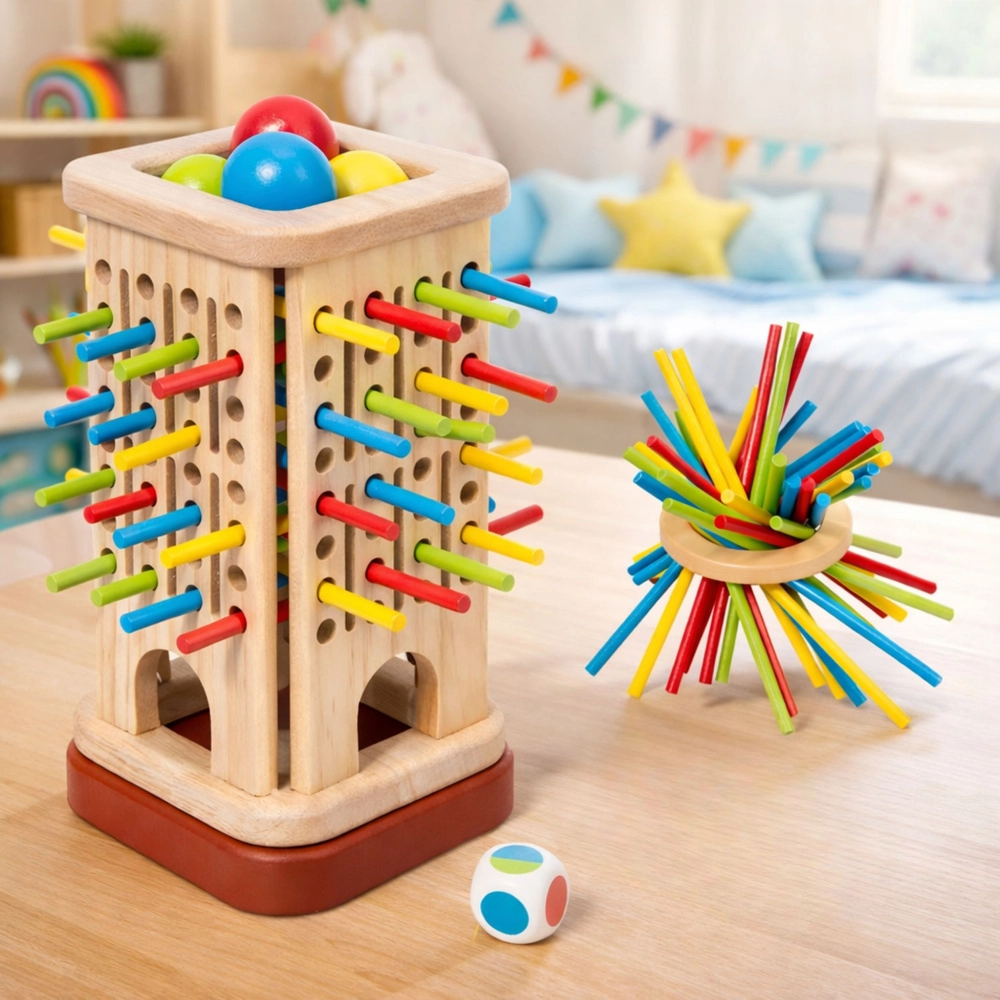 Il gioco di abilità in legno a forma di torre è ideale per bambini e adulti. L’obiettivo è estrarre con cautela i bastoncini in modo che le biglie all’interno della torre non cadano. Ogni turno mette alla prova motricità fine, precisione e ragionamento strategico. Grazie al legno naturale di qualità, il gioco è resistente e sicuro; inoltre, i colori vivaci favoriscono la percezione cromatica e la concentrazione.