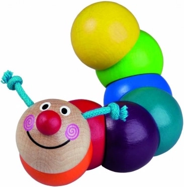 Un bruco colorato in perline di legno infilate su un elastico supporta lo sviluppo della motricità fine già dai 6 mesi. È atossico, conforme alle norme UE e, grazie alla lunghezza compatta di 13 cm, si impugna facilmente anche dalle manine più piccole.
