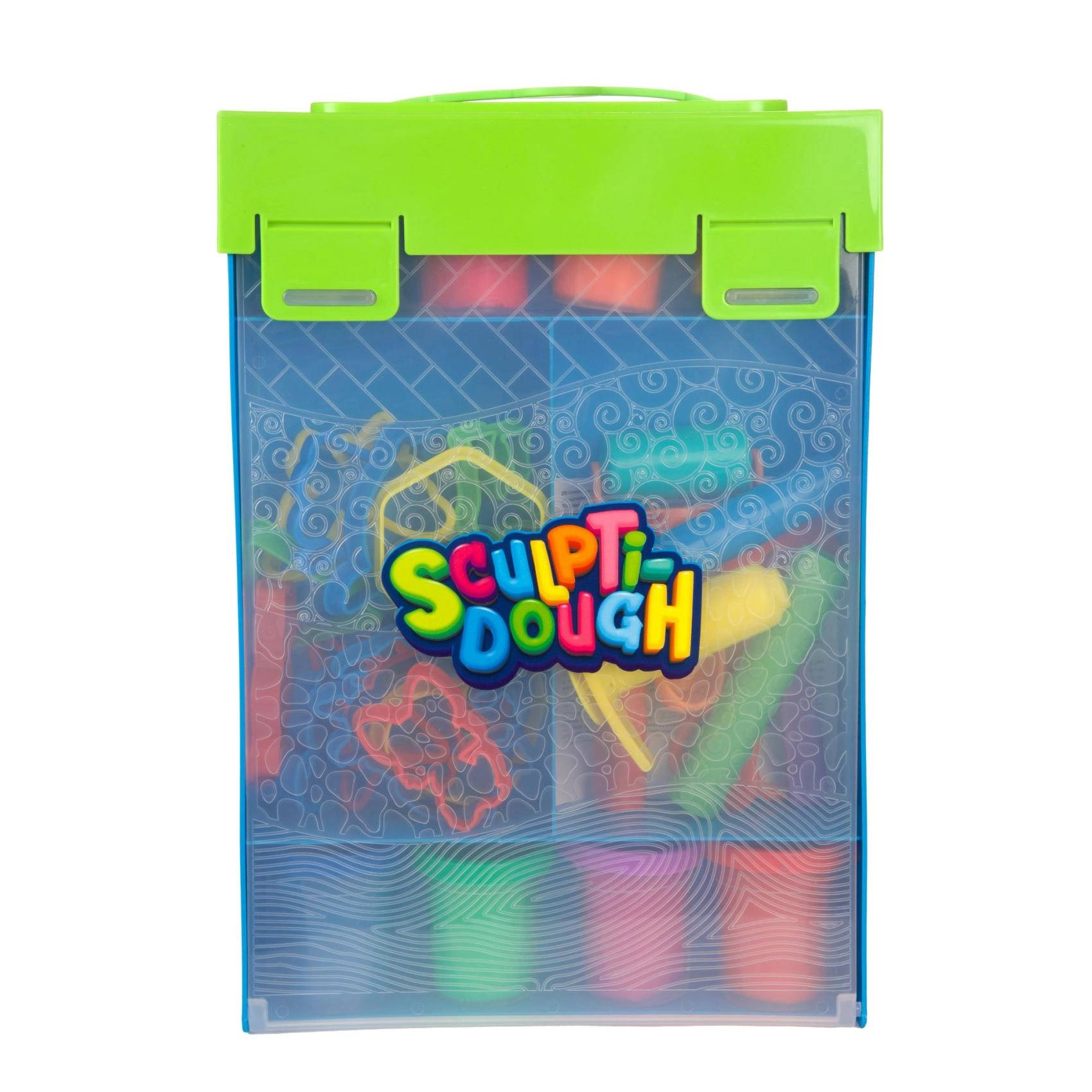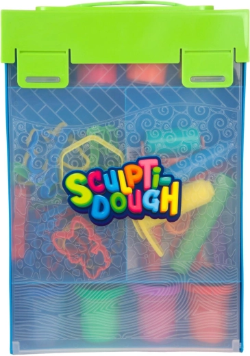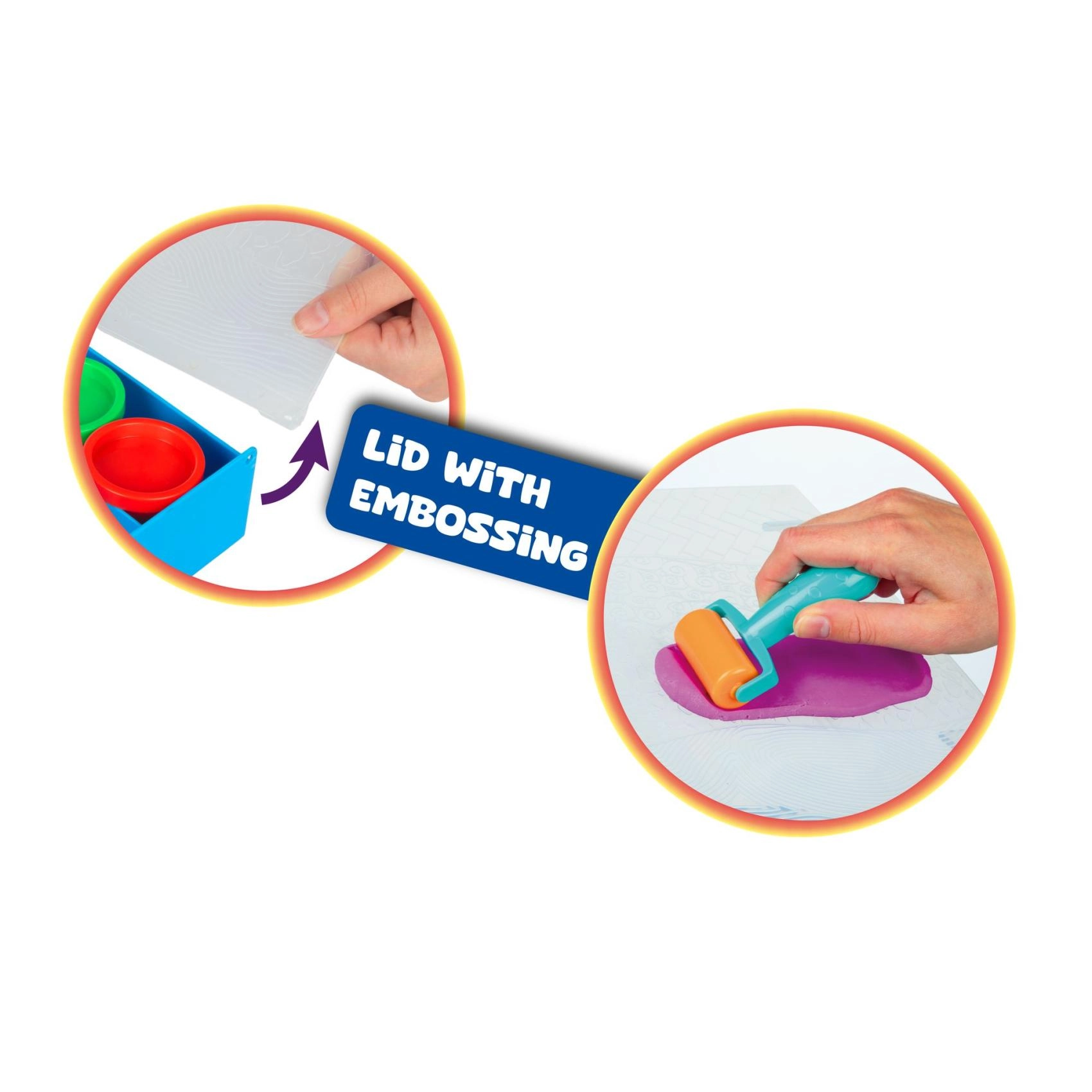 Il set comprende una vasta gamma di strumenti e formine – mattarello, taglierine a rotella, forbici, coltellini, mattarelli con texture ed estrusore – che aprono nuove possibilità di modellazione. Il box di plastica con coperchio e manico mantiene vasetti e accessori in ordine, rendendo il set facile da riporre e trasportare.