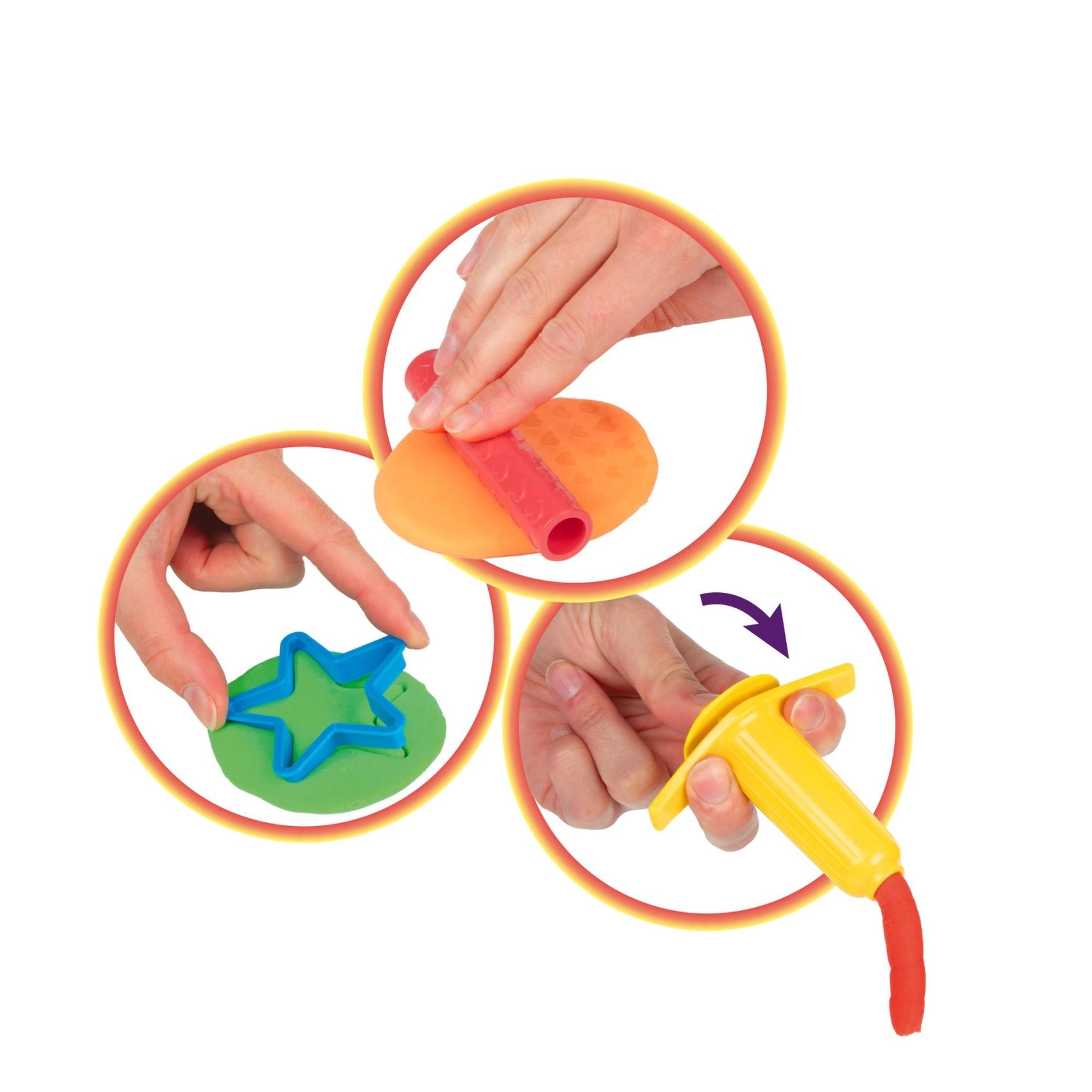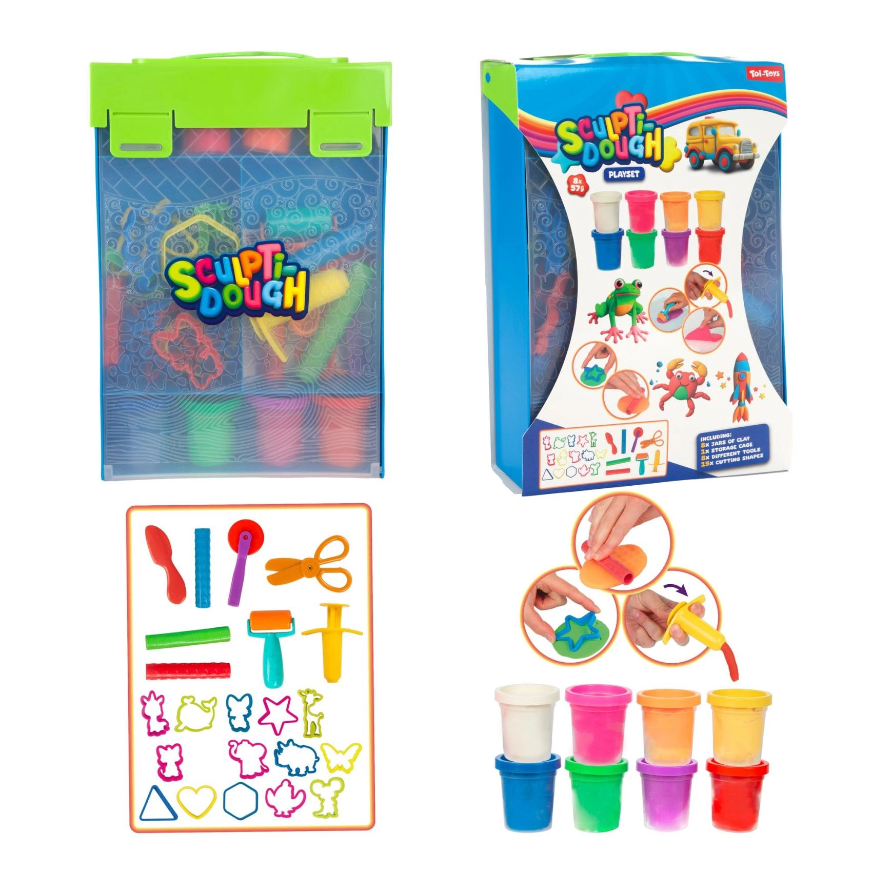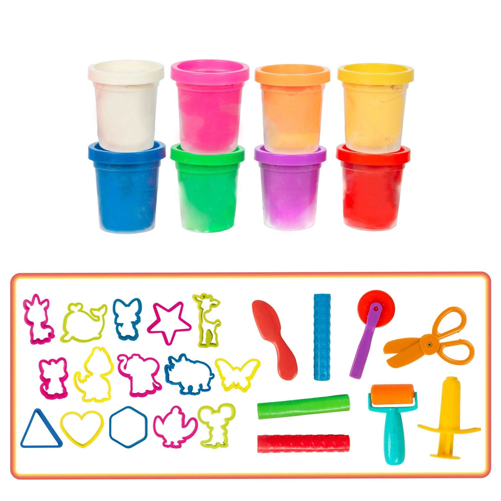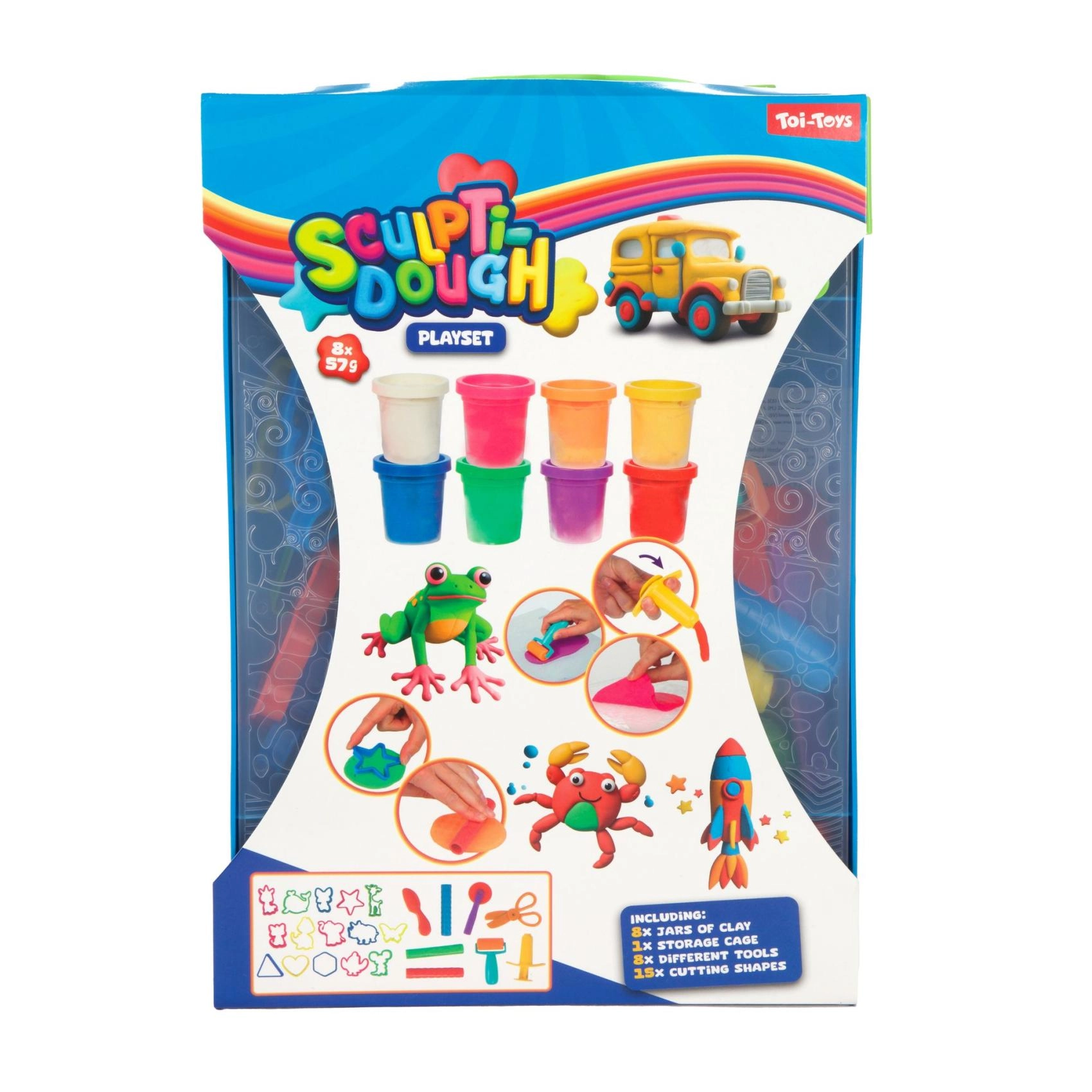 Otto vasetti di pasta da modellare sono accompagnati da mattarelli, coltellini, forbici e formine: i bambini possono iniziare subito a creare senza ulteriori acquisti.