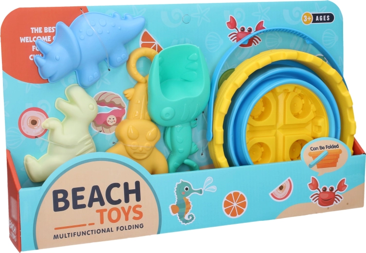 Divertente set per sabbia a tema dinosauri per bambini, contiene un secchiello pieghevole, una paletta, un rastrellino e due formine. Perfetto per la spiaggia e il parco giochi: leggero, resistente e facile da pulire. Sviluppa la motricità, stimola la creatività e offre divertimento senza fine all’aperto.