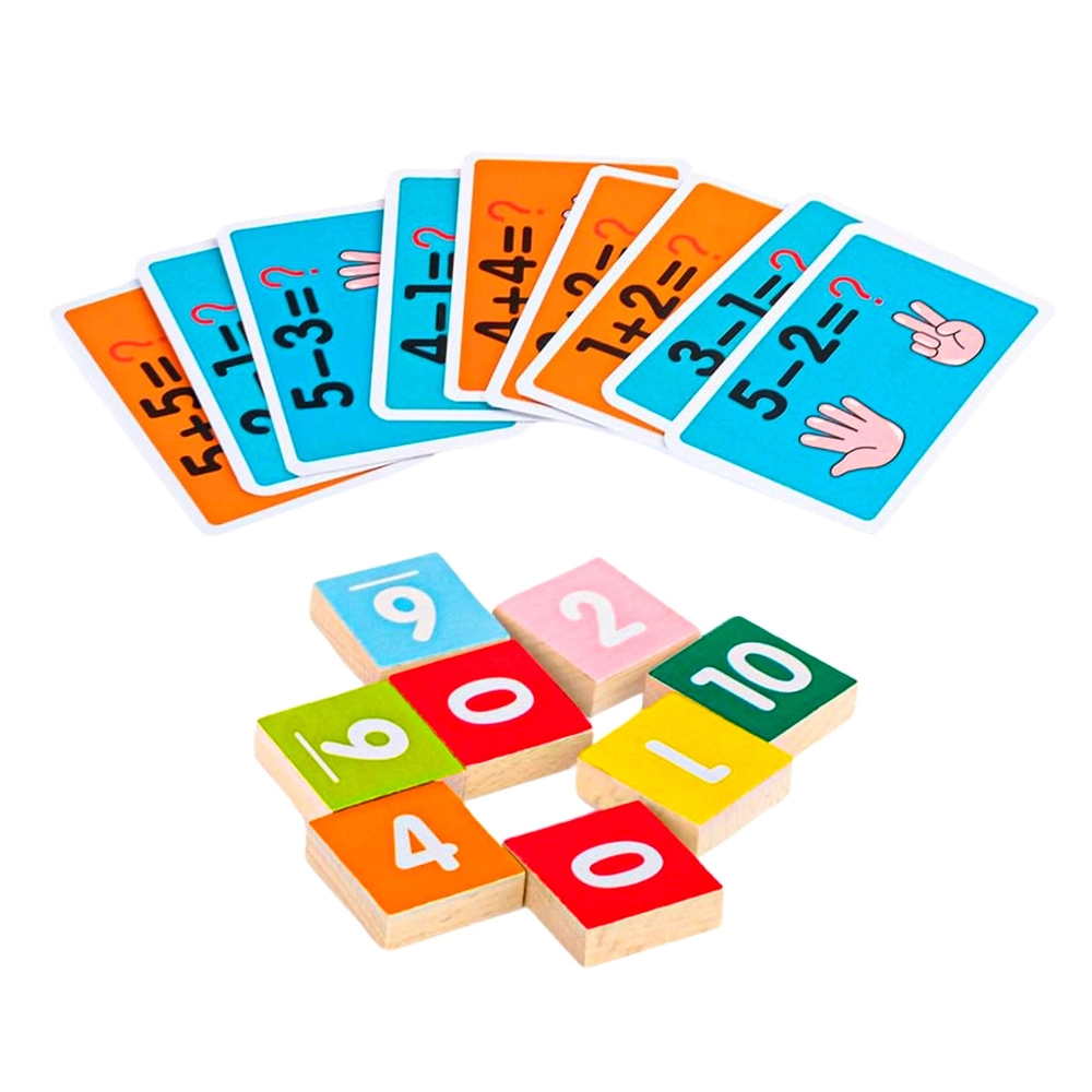 Allena addizioni e sottrazioni seguendo le carte intuitive e componi gli esercizi con i tasselli in legno colorati con simboli e numeri.