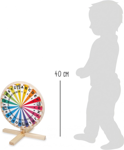 La robusta struttura in legno con supporto stabile assicura un funzionamento fluido e sicuro durante la rotazione. La ruota è ideale per scuole, doposcuola, laboratori per bambini e uso domestico, dove favorisce lo sviluppo di motricità fine, vocabolario, calcolo e capacità di concentrazione.