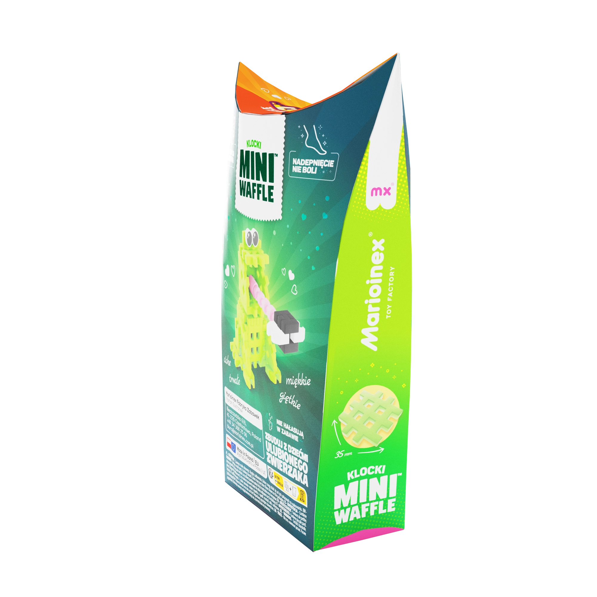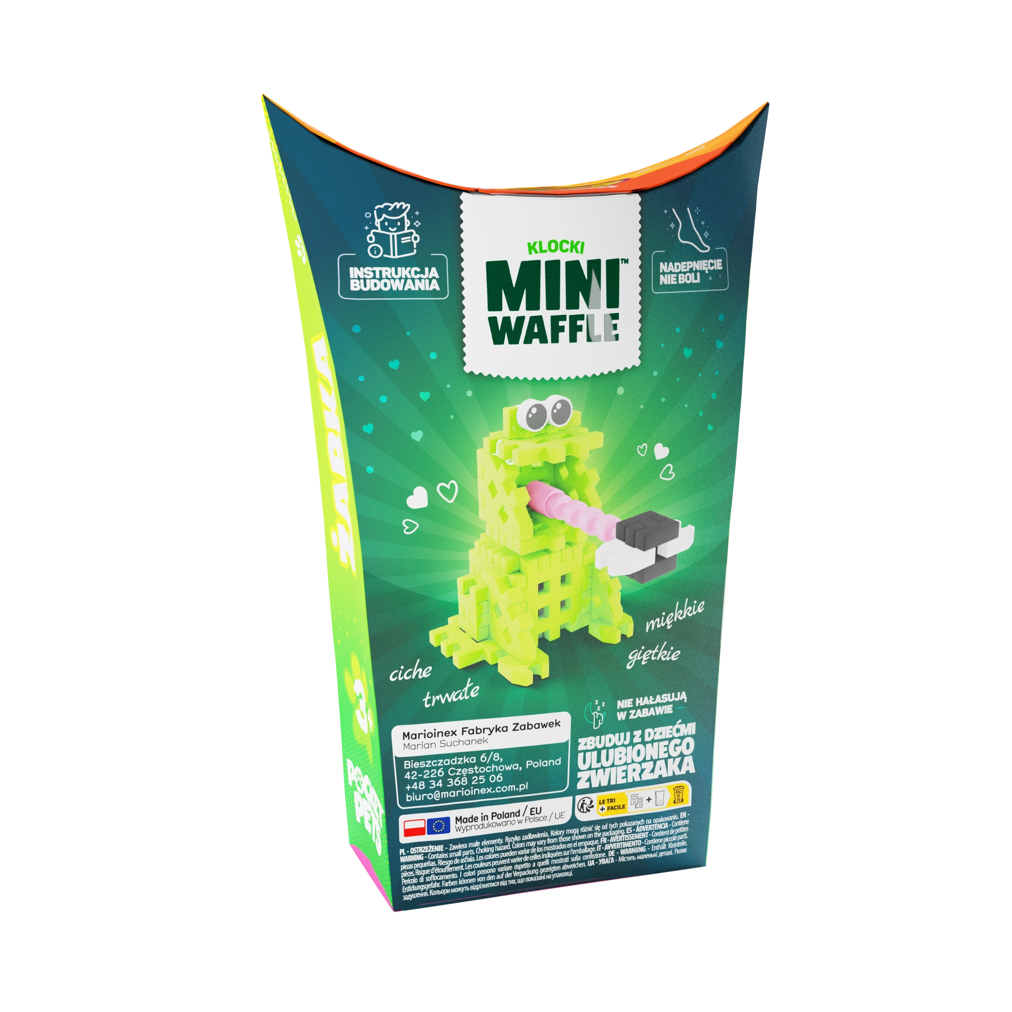 Scopri il divertimento con il set di costruzioni Mini Waffle Pocket Pets – ranocchia del marchio Marioinex. Il set compatto con 34 pezzi colorati permette ai bambini di costruire una graziosa figurina di rana, creare in 2D e 3D e sviluppare creatività, motricità fine e pensiero logico. I pezzi sono flessibili, resistenti e sicuri, si uniscono e separano facilmente e si combinano alla grande con altri set Mini Waffle.