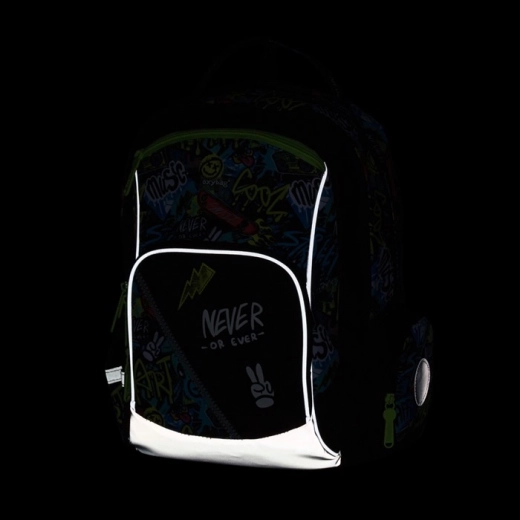 Schienale anatomico e traspirante e spallacci imbottiti regolabili garantiscono un trasporto confortevole per tutta la giornata scolastica. Gli elementi riflettenti aumentano la visibilità.