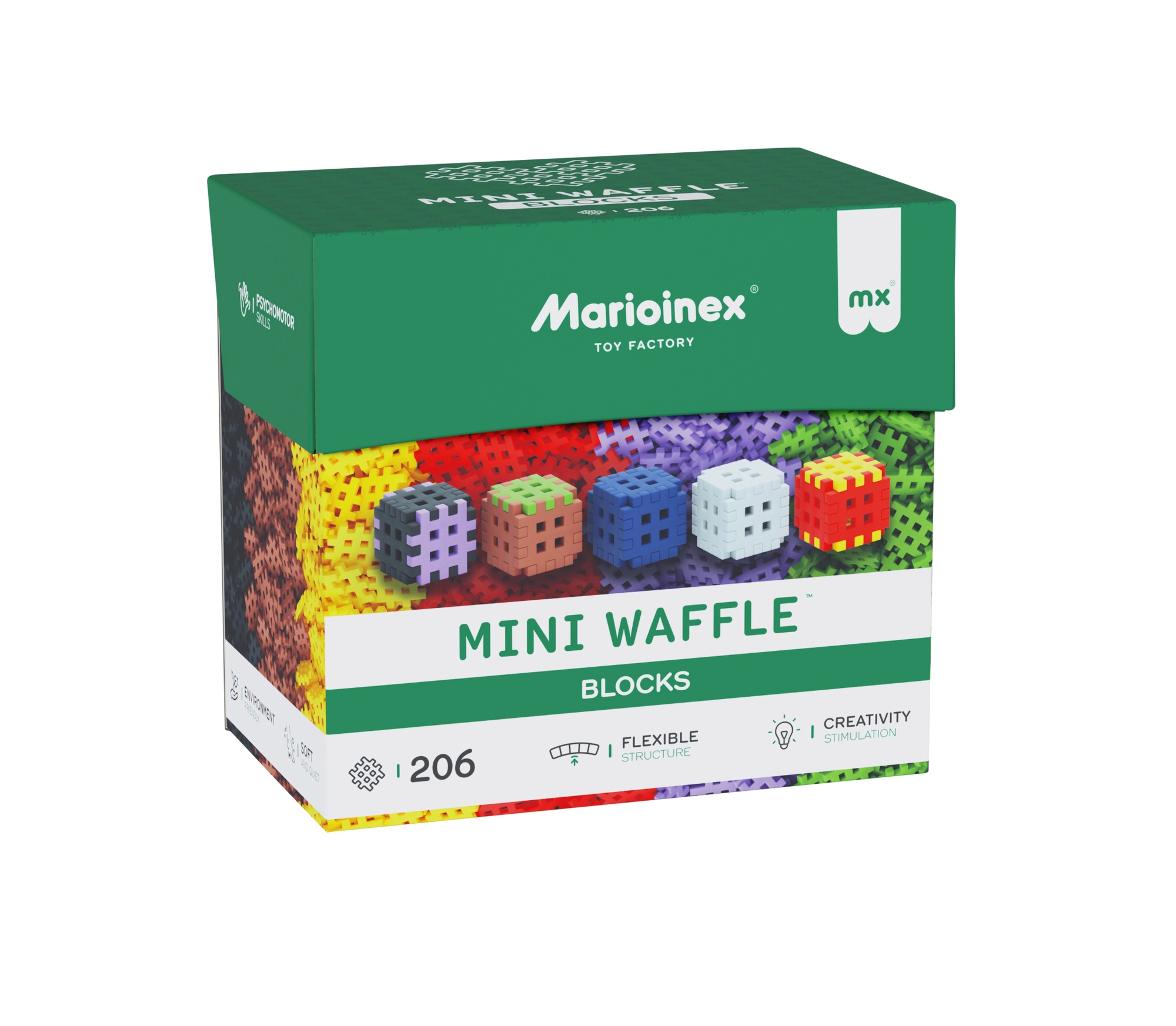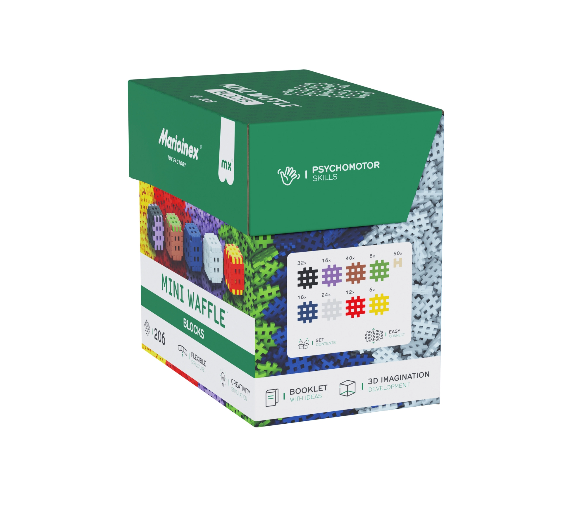 Il grande set di mini mattoncini waffle colorati ispira alla creazione di personaggi, veicoli e costruzioni architettoniche. Ideale per il gioco libero e per attività guidate.