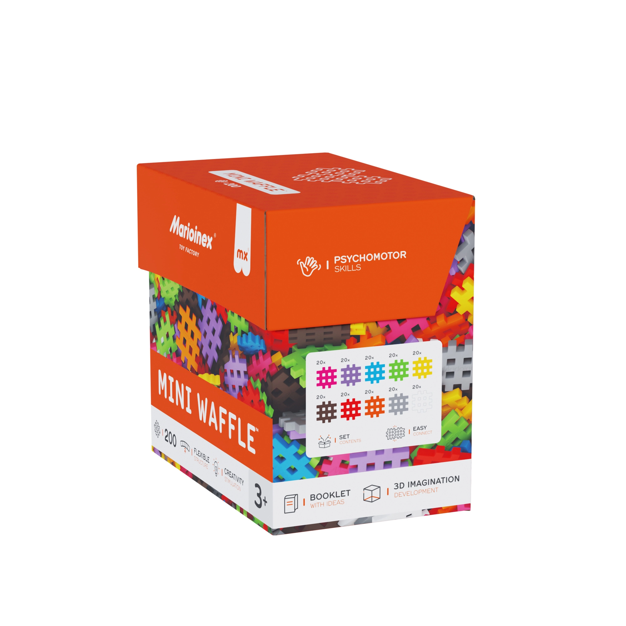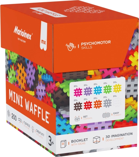 Il set Marioinex Mini Waffle offre infinite possibilità creative, da oggetti semplici a costruzioni 3D elaborate. I pezzi hanno una texture morbida e piacevole e si uniscono e separano facilmente, favorendo un apprendimento naturale, concentrazione e pazienza. Grazie alla forma unica sono ideali per le mani dei bambini e incoraggiano il gioco indipendente.
