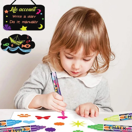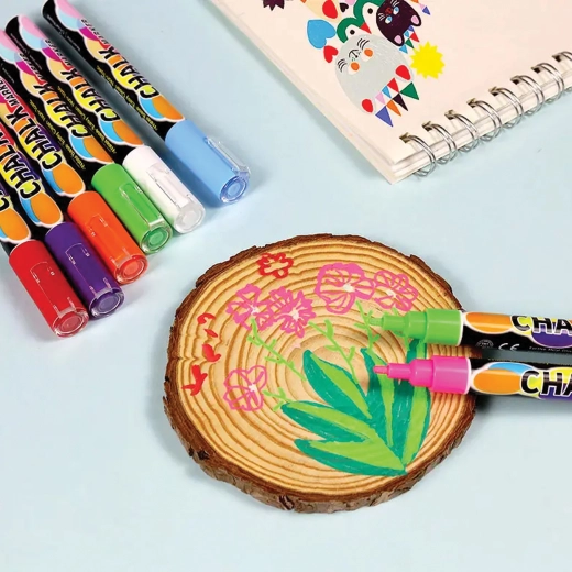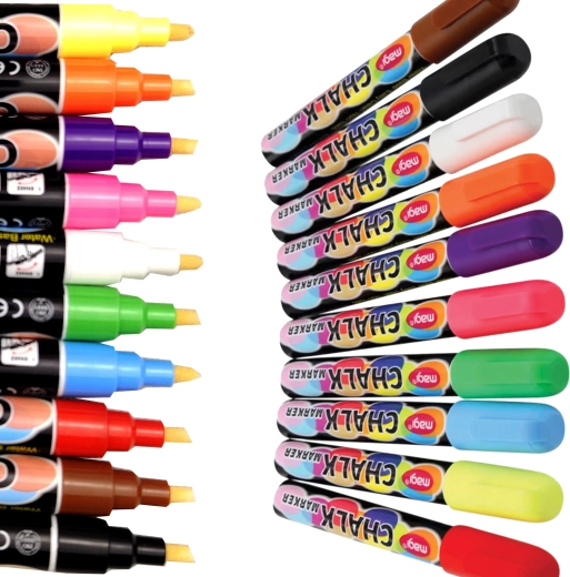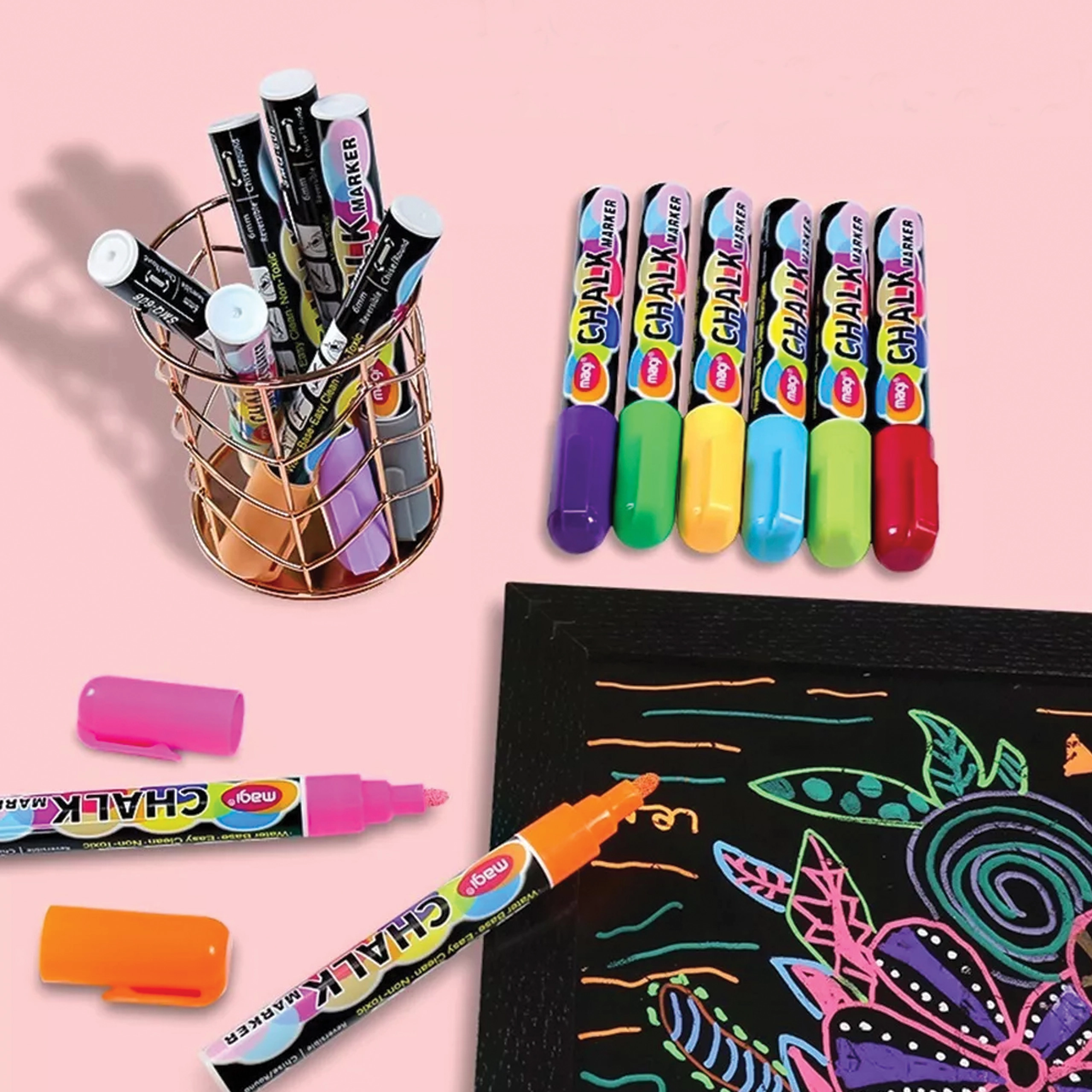 Pratico set di pennarelli a gesso per lavagne, vetro e altre superfici lisce. L'inchiostro a base d'acqua è senza polvere, inodore, asciugatura rapida e facilmente cancellabile con un panno umido. Ideale per ufficio, scuola e casa – per presentazioni, disegno e progetti creativi con colori vividi e intensi.