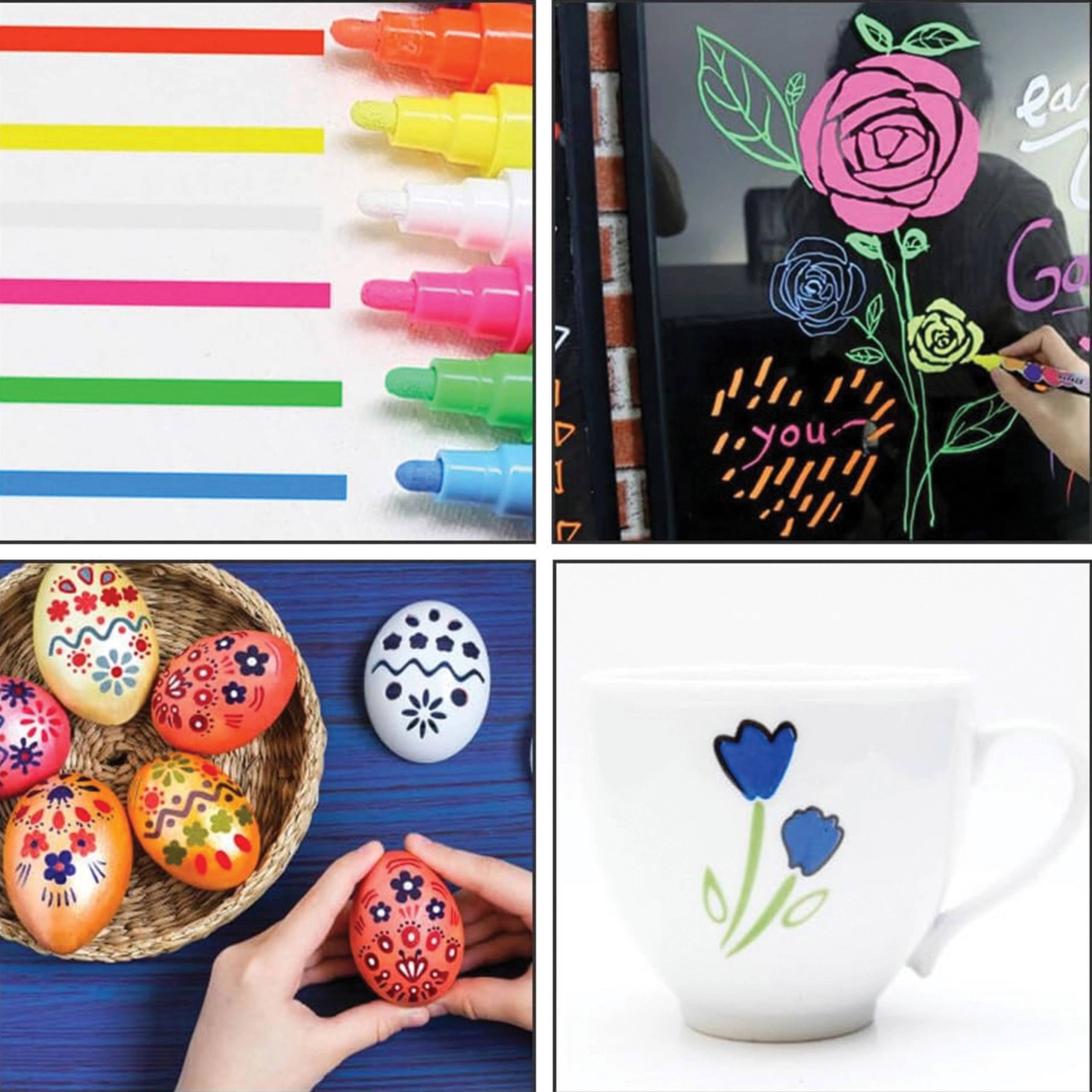 I pennarelli scrivono in modo coprente su vari materiali lisci: vetrine, tazze, piatti, decorazioni o uova di Pasqua.
