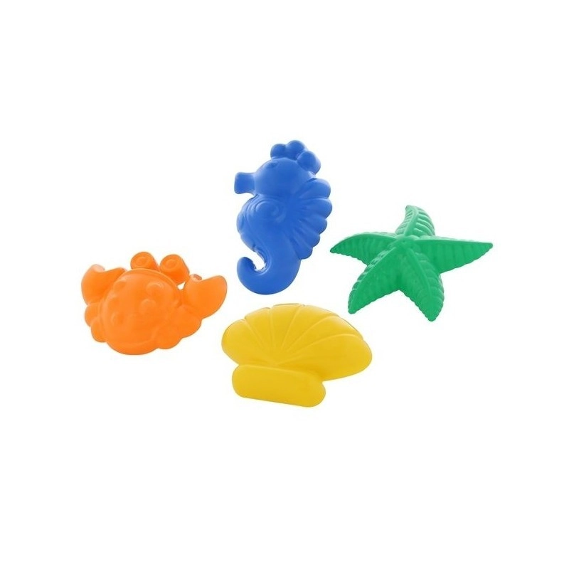 Divertente set di 4 formine di plastica per la sabbia a forma di granchio, stella marina, conchiglia e cavalluccio marino, che trasforma ogni sabbiera o spiaggia in un laboratorio creativo. I bambini creano facilmente bellissime impronte, sviluppano la motricità fine, la fantasia e si godono tanto divertimento all’aperto.