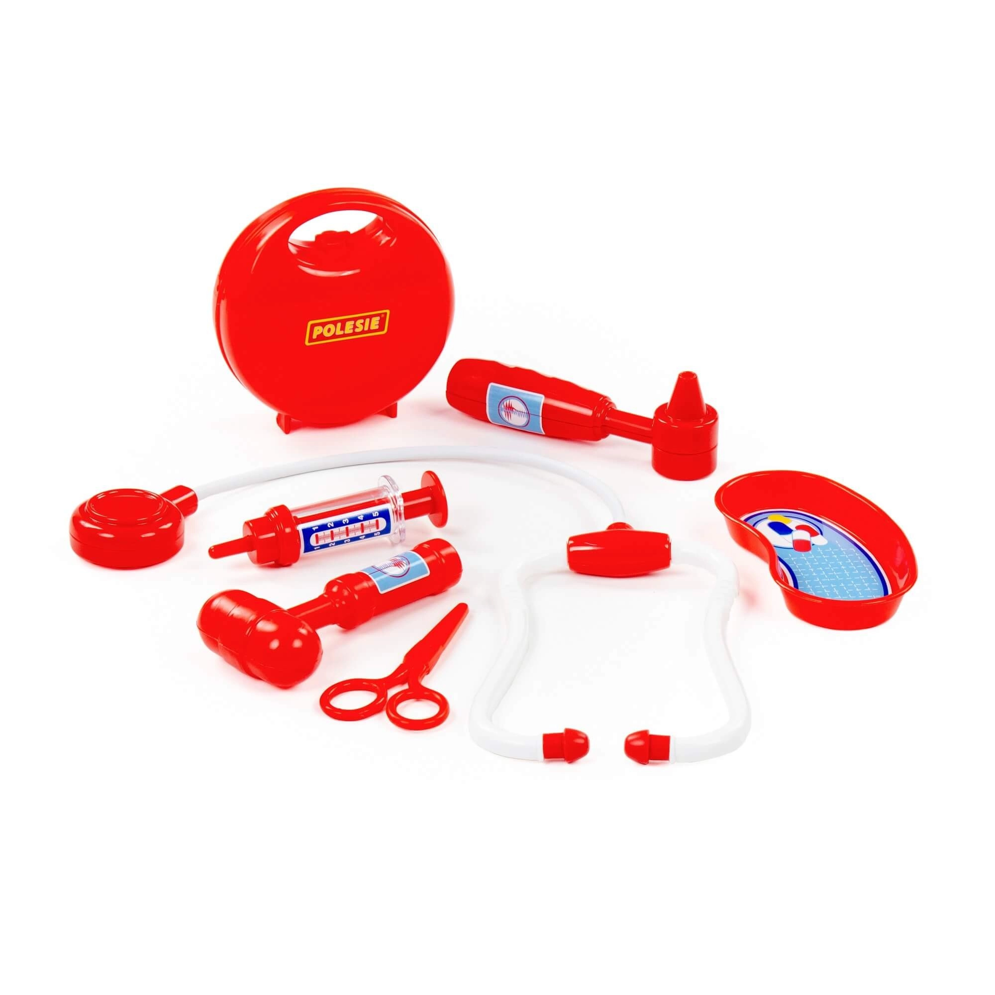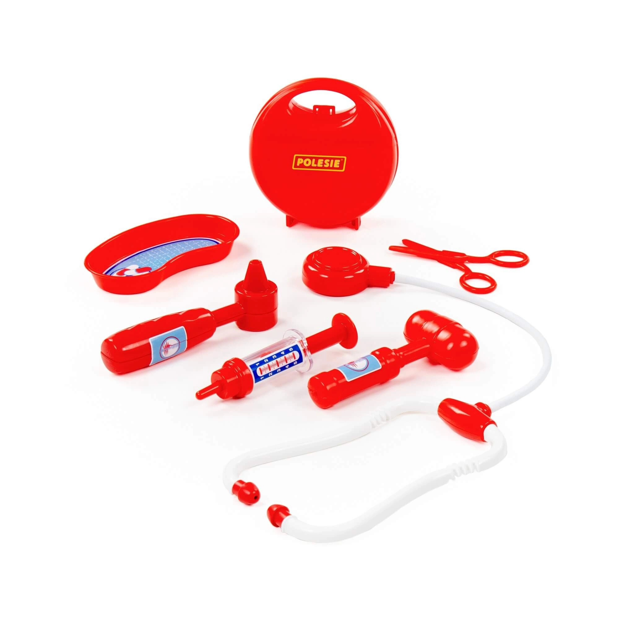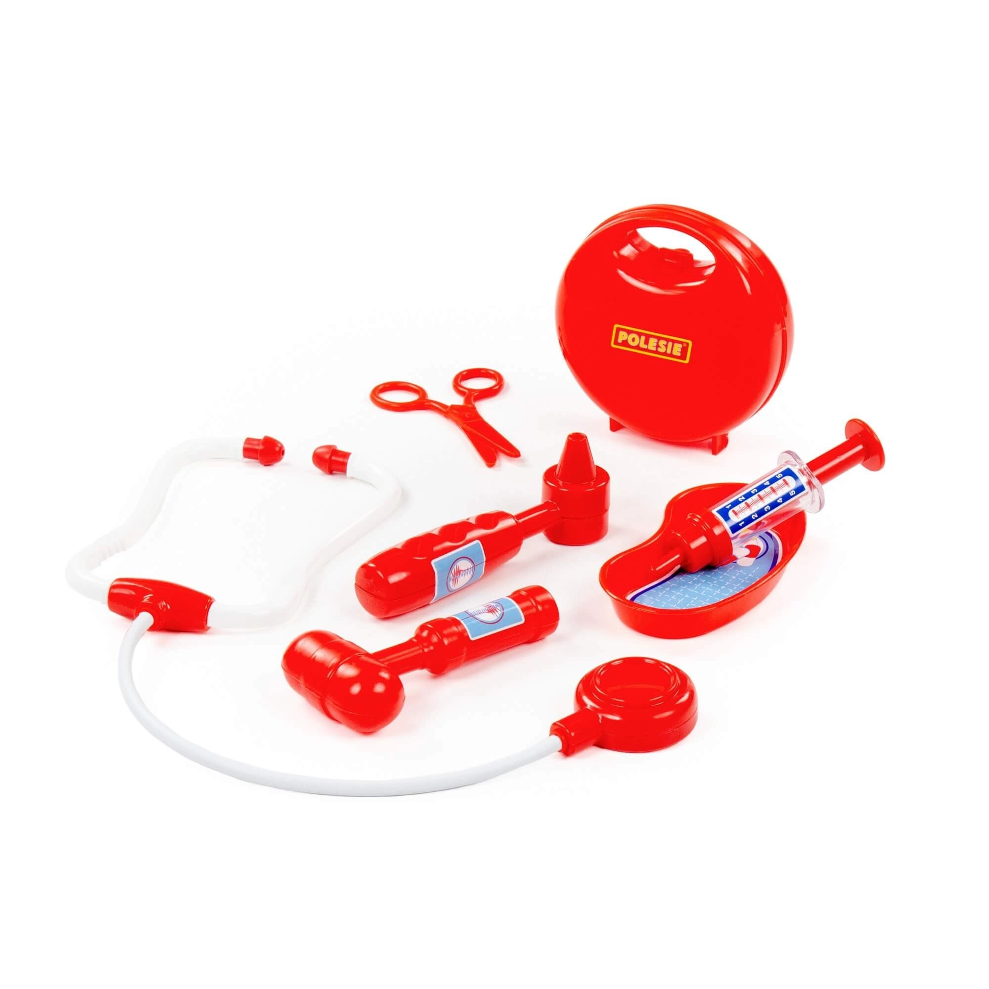 Include stetoscopio, siringa, otoscopio, martelletto riflessi, forbici e vaschetta reniforme per un’autentica esperienza da medico.