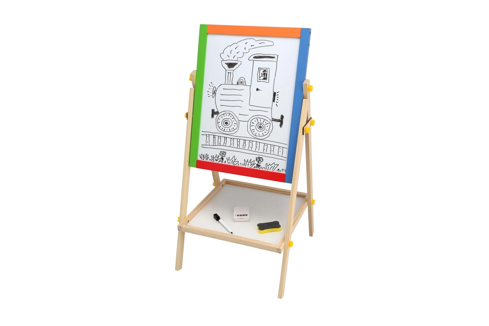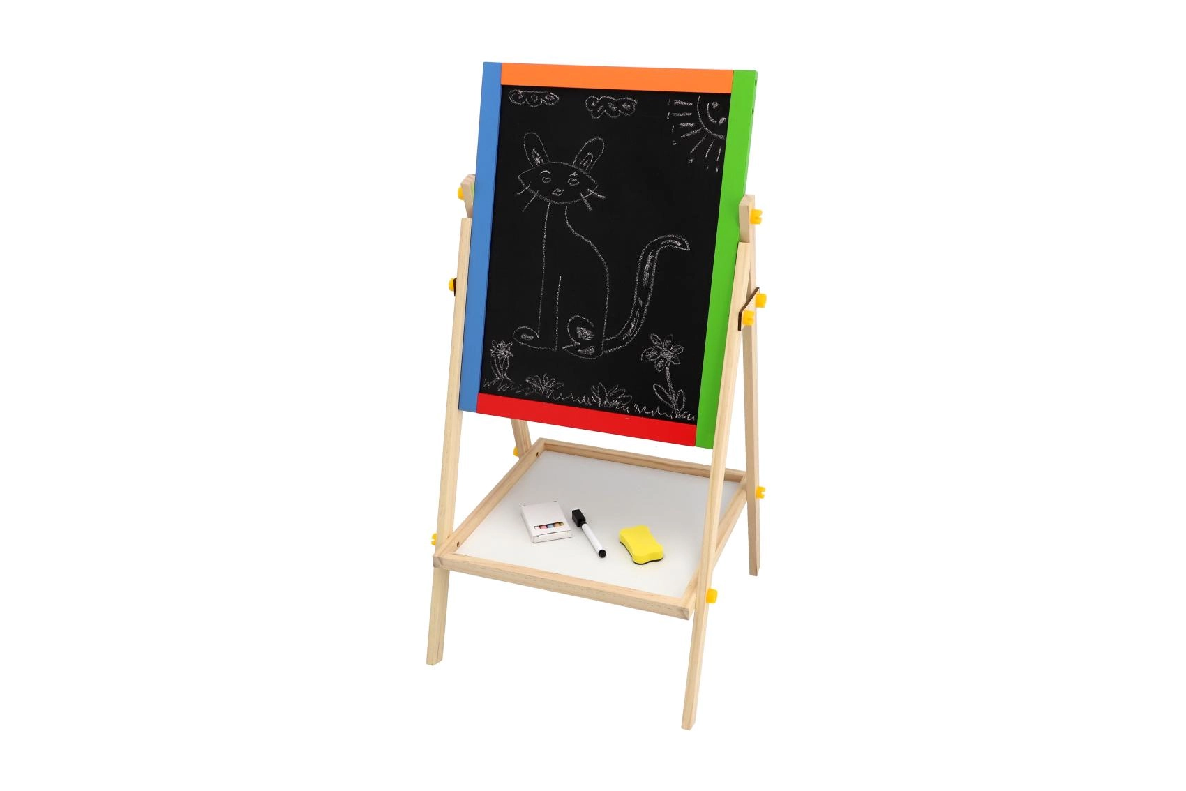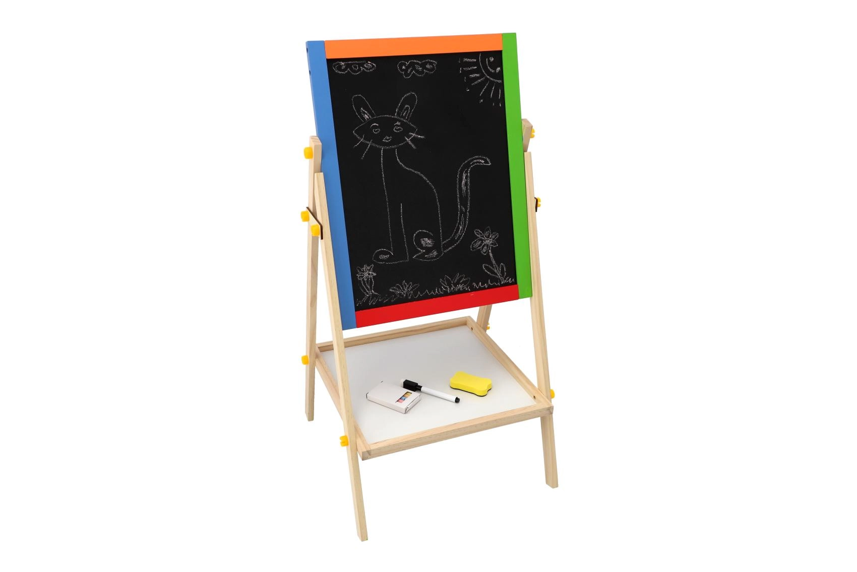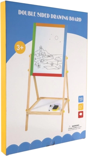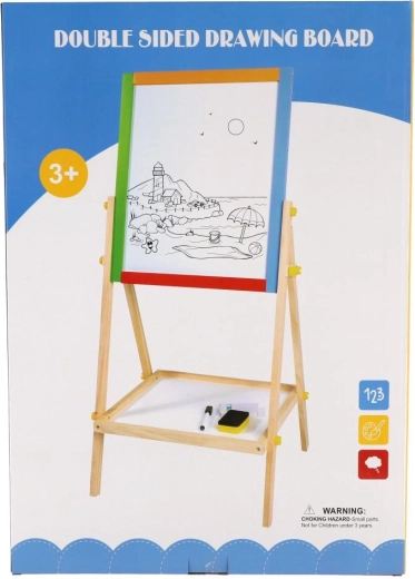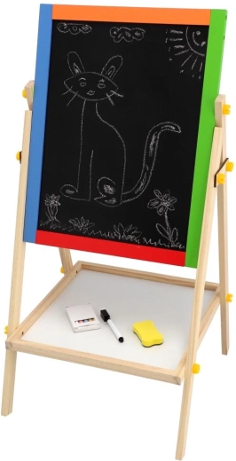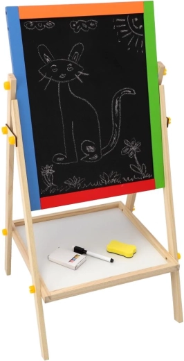 Questa lavagna bifacciale stimola creatività, motricità fine e le prime abilità scolastiche. I bambini possono alternare disegno con i gessetti e scrittura con il pennarello, imparare le lettere con i magneti ed esercitare il calcolo – tutto in un unico posto.