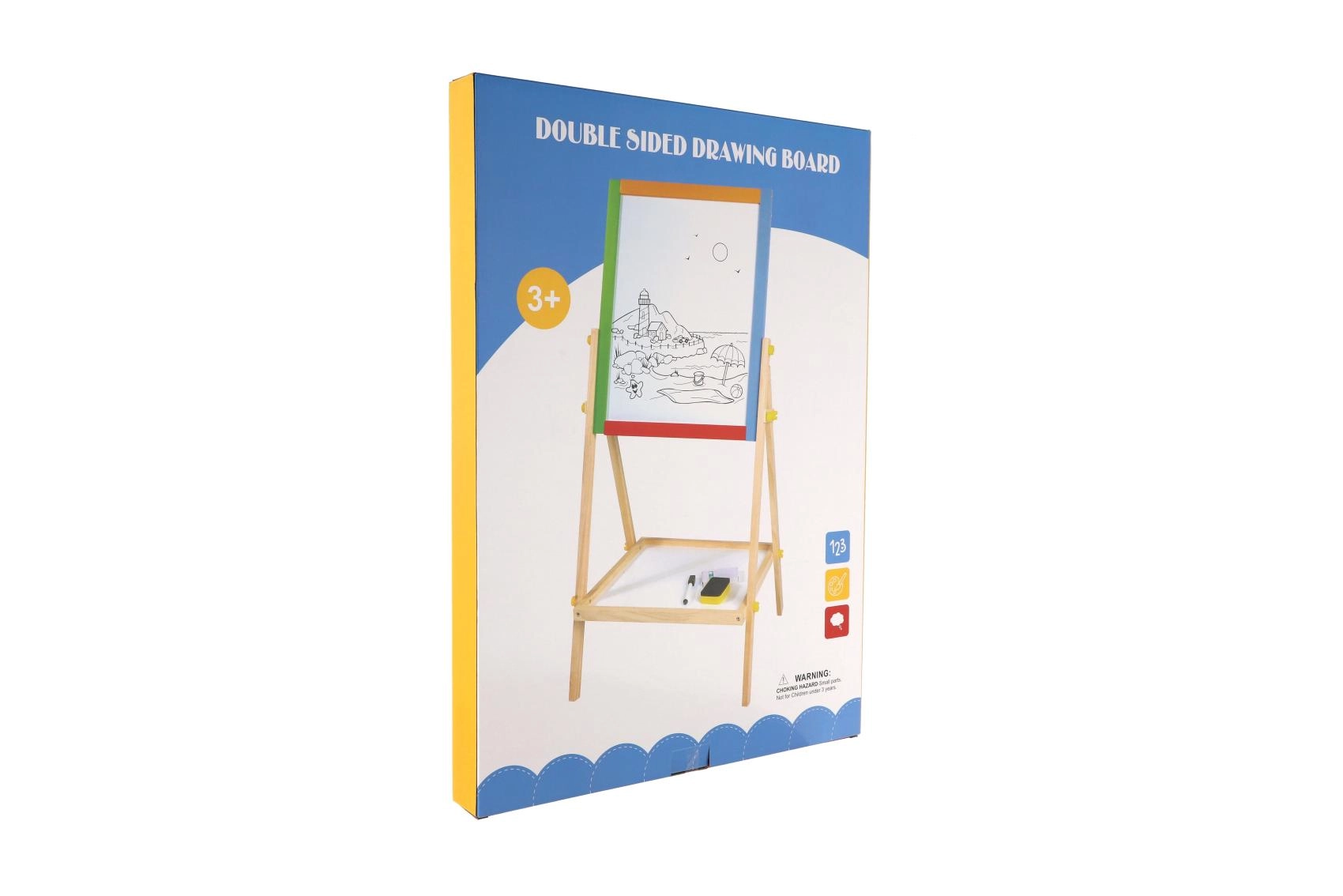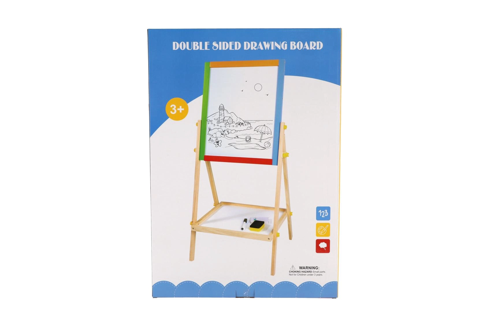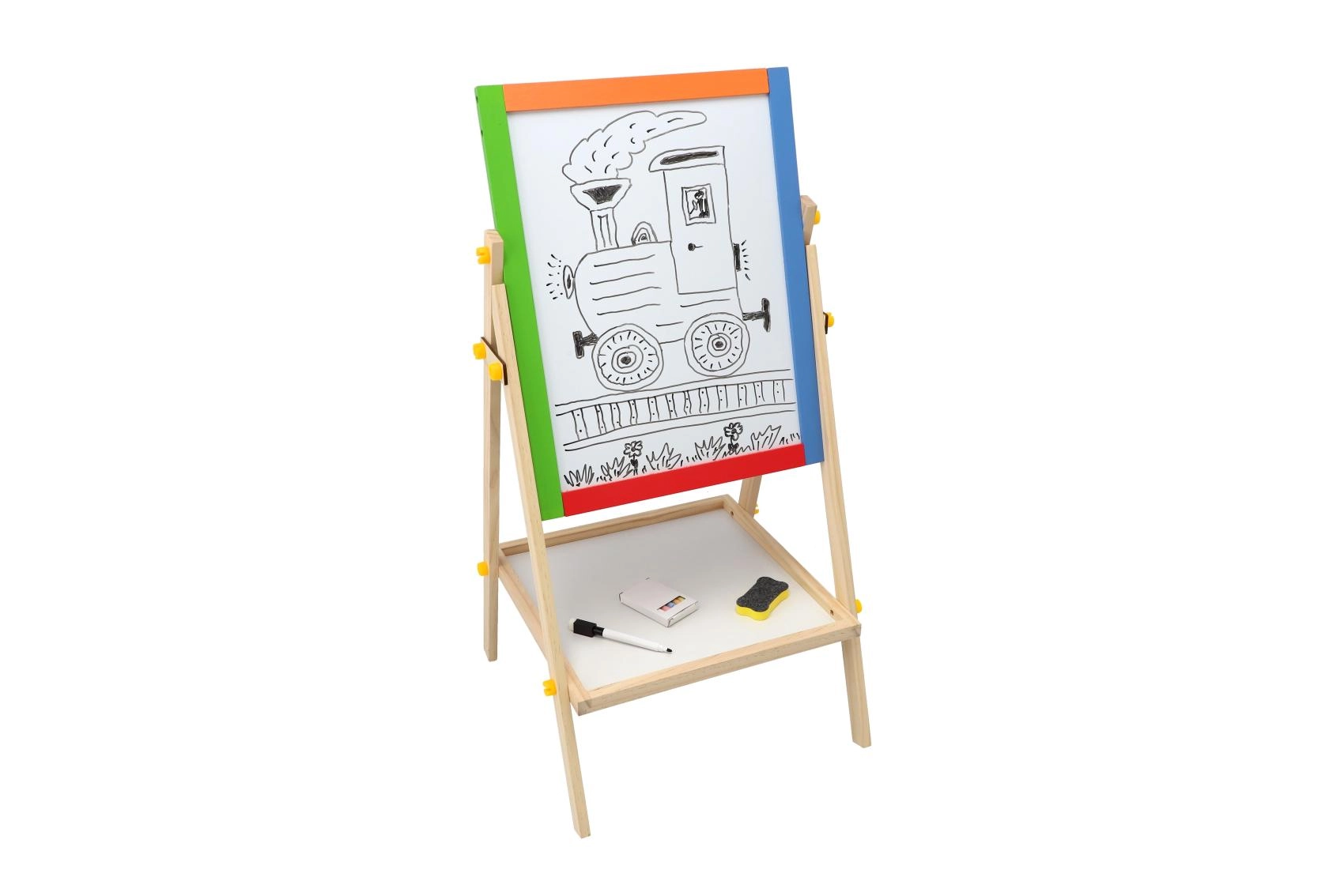 Questa lavagna bifacciale stimola creatività, motricità fine e le prime abilità scolastiche. I bambini possono alternare disegno con i gessetti e scrittura con il pennarello, imparare le lettere con i magneti ed esercitare il calcolo – tutto in un unico posto.