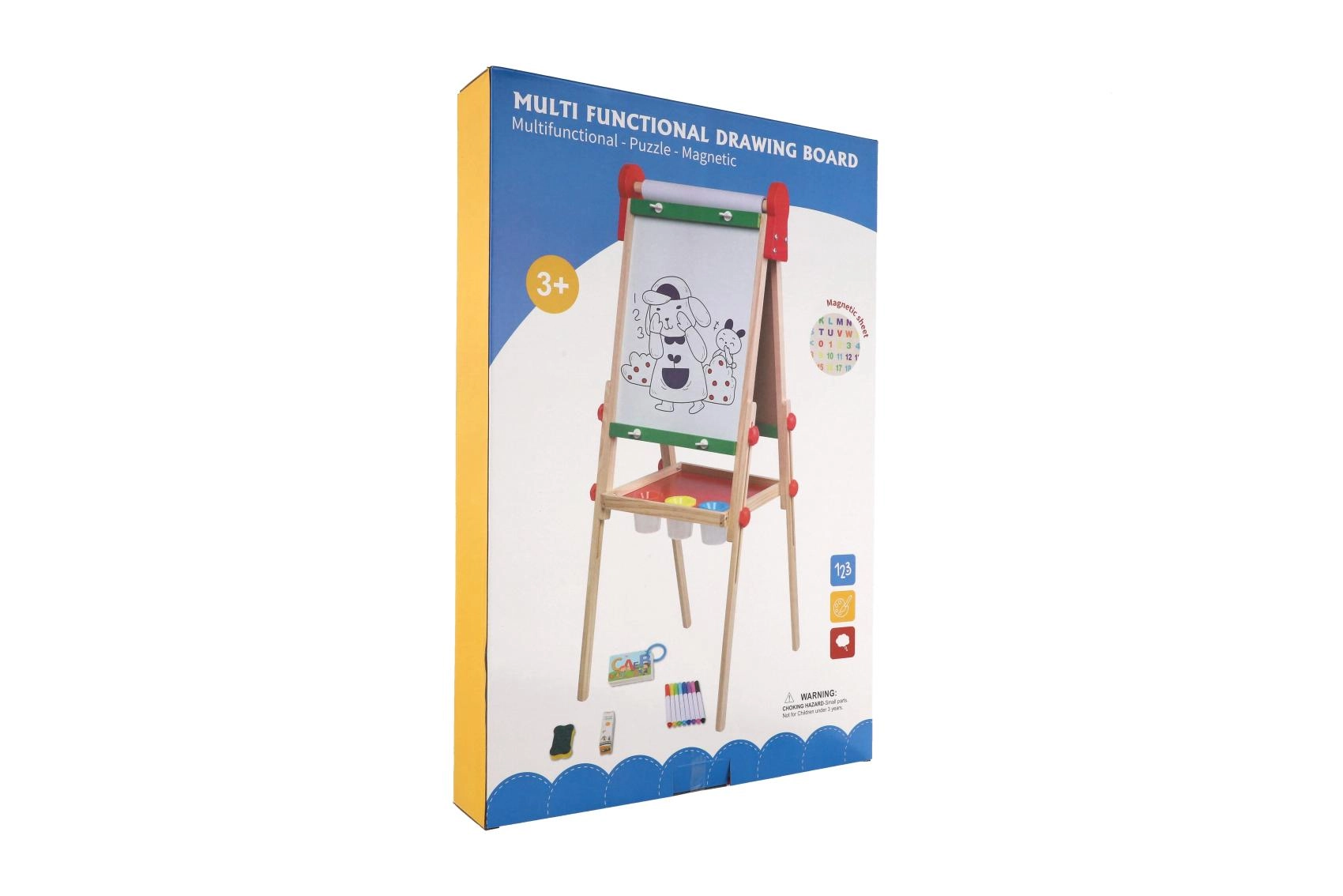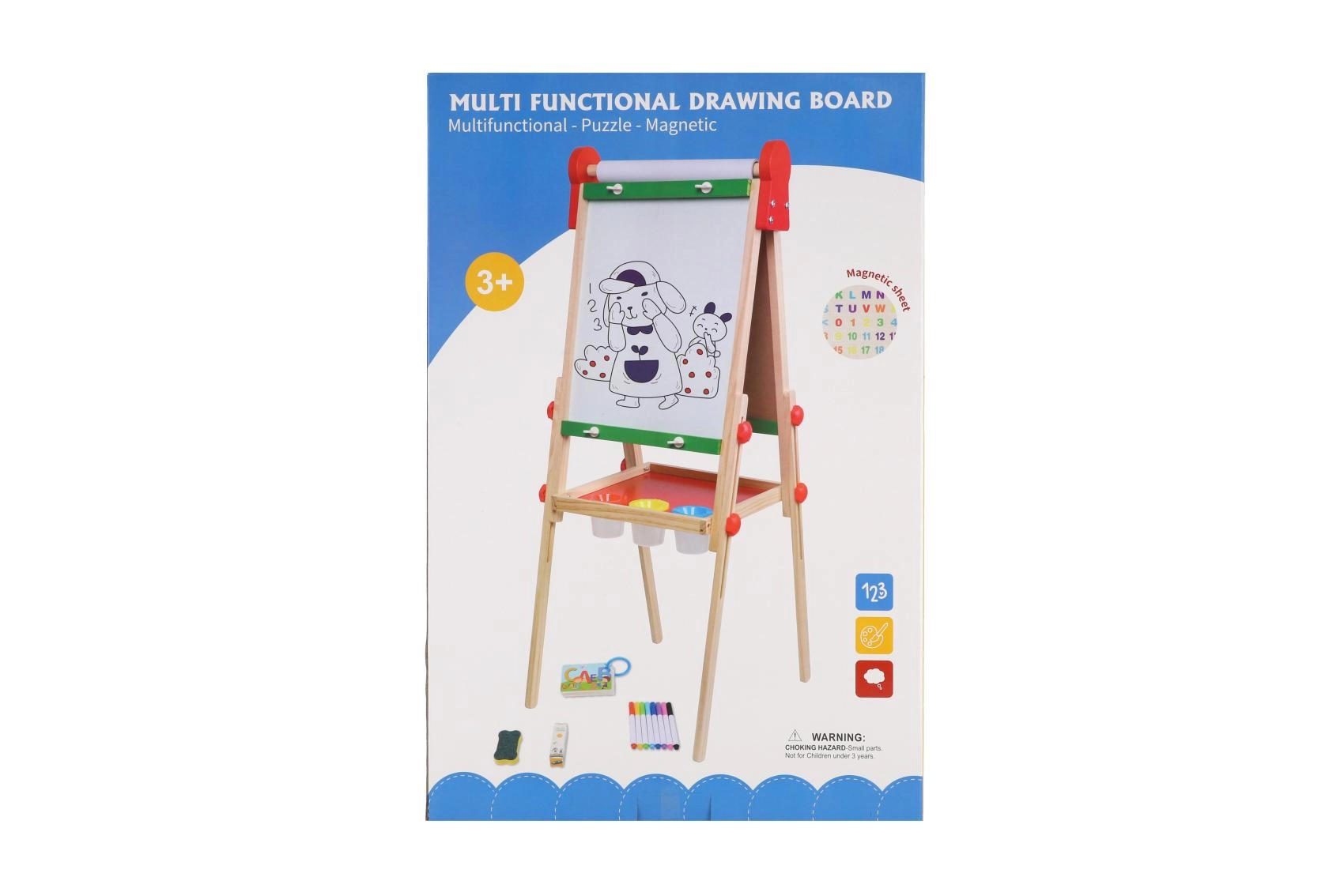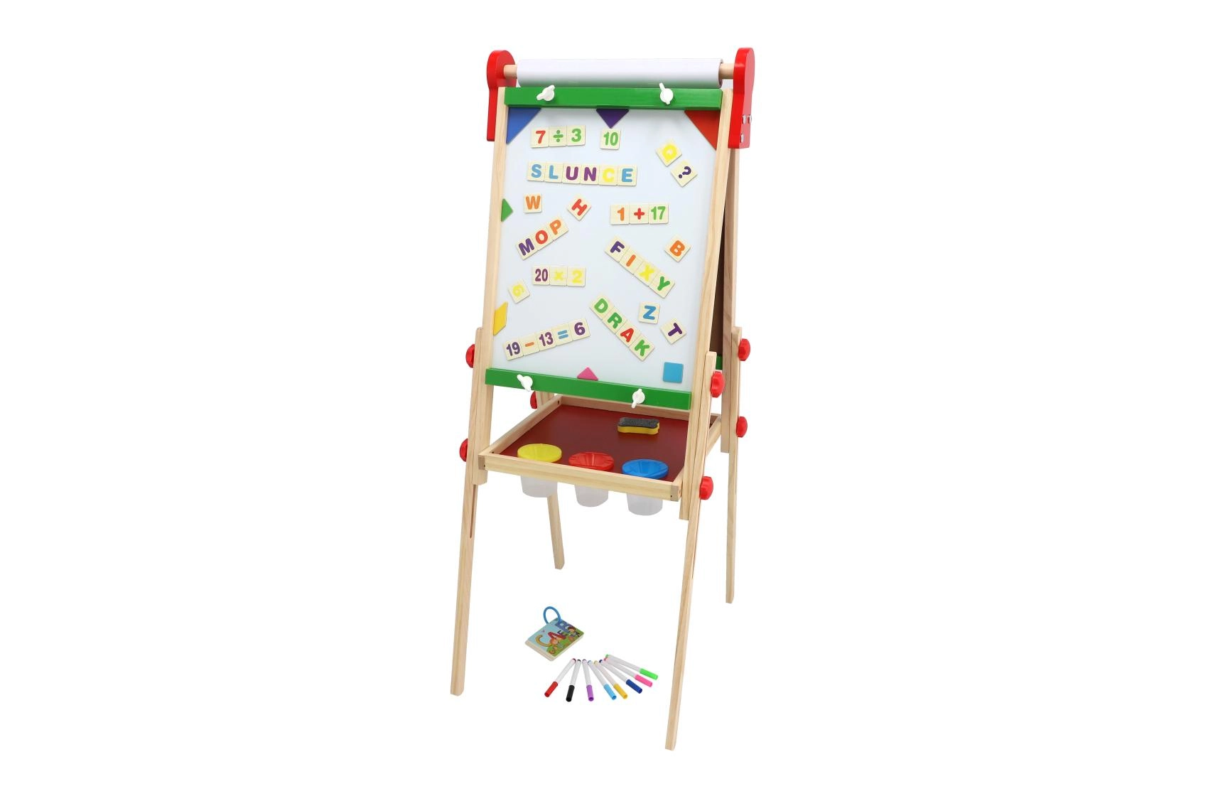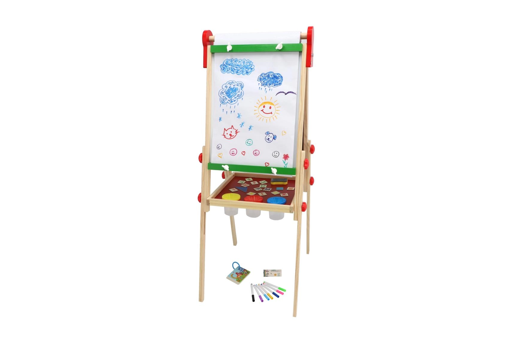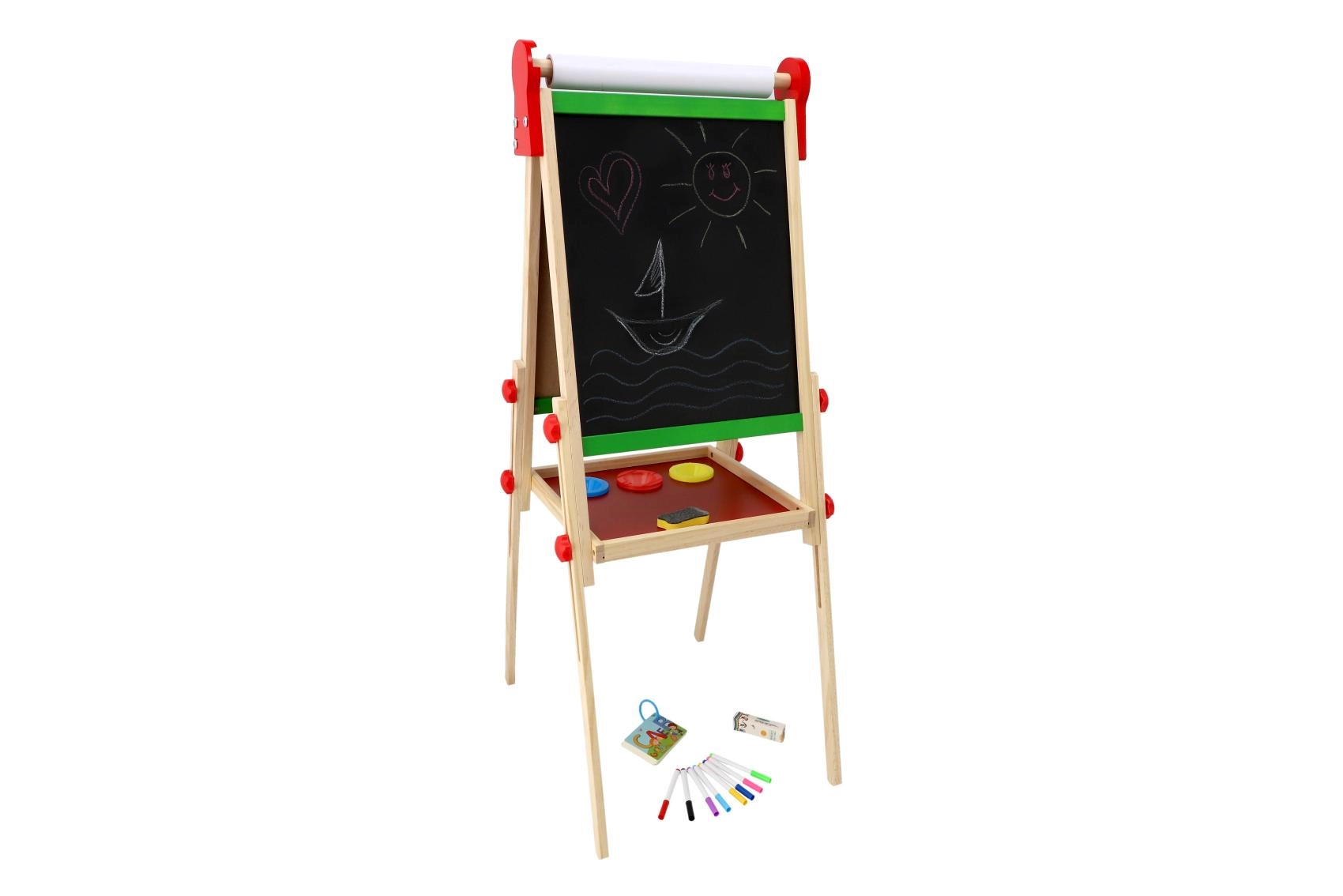 La struttura in legno stabile con pratica mensola portaoggetti tiene a portata di mano gessetti, pennarelli e spugnetta, così tutto resta ordinato e sicuro. La ricca dotazione stimola creatività, motricità fine e abilità prescolari – scrittura, calcolo e riconoscimento delle forme.