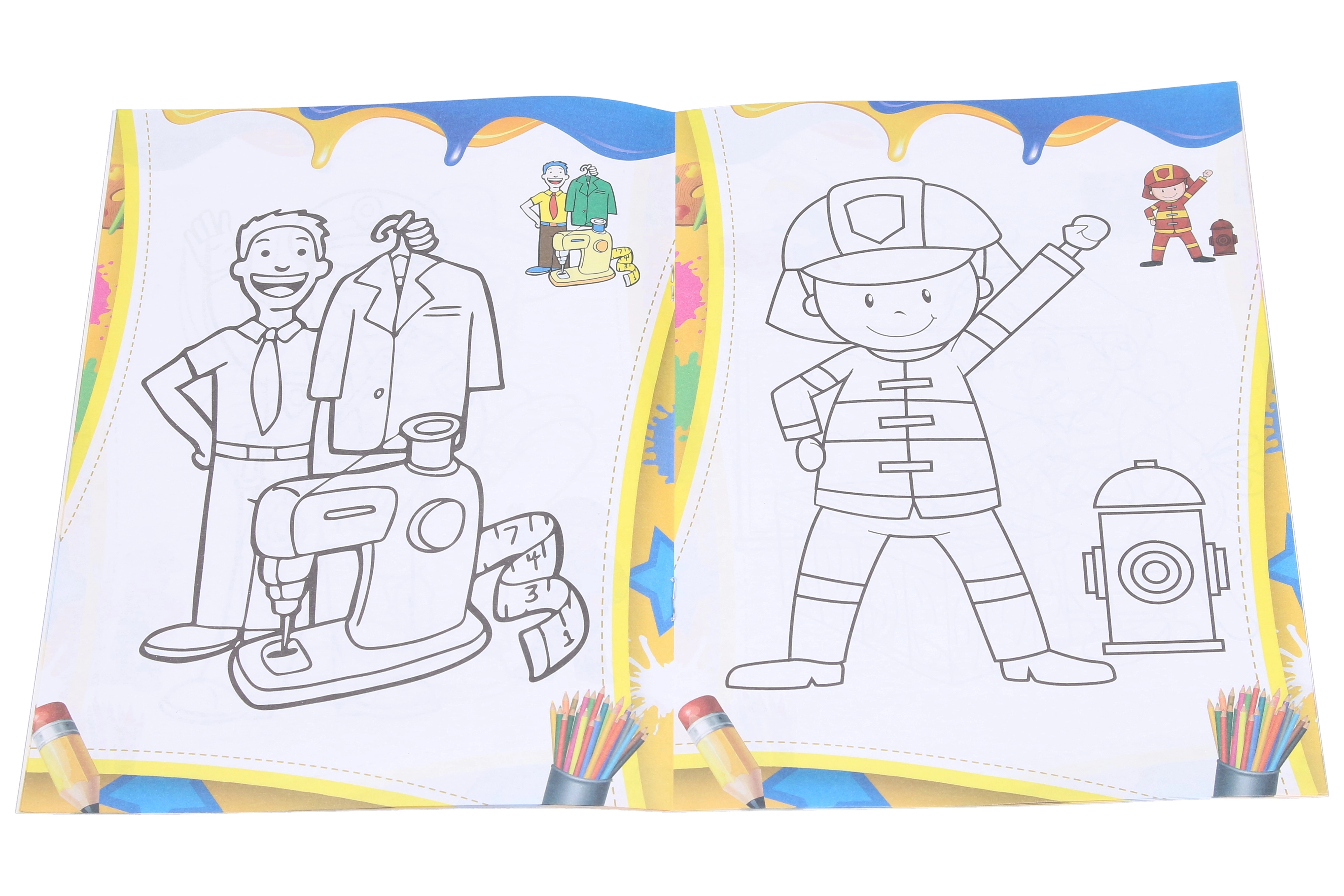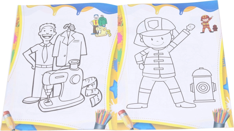- 12 pagine di divertenti illustrazioni di varie professioni (ad es. medico, pompiere, cuoco, ecc.).