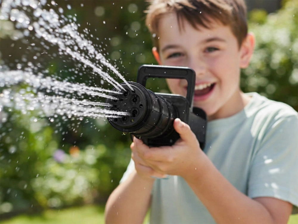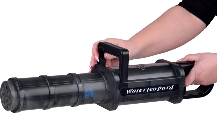 Basta riempire e premere il grilletto. Il blaster aspira l’acqua da solo ed emette un getto continuo senza stancante pompaggio, ideale per battaglie d’acqua intense.