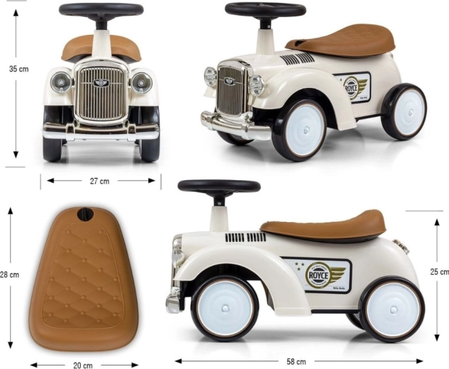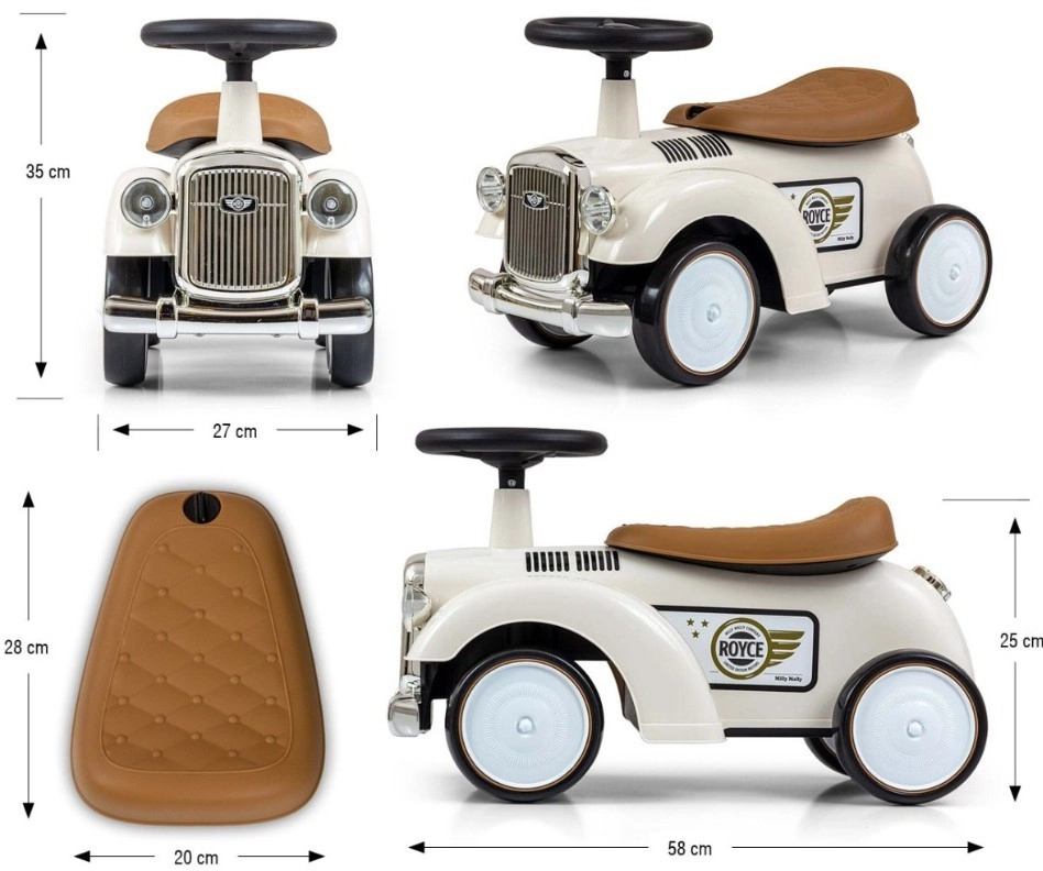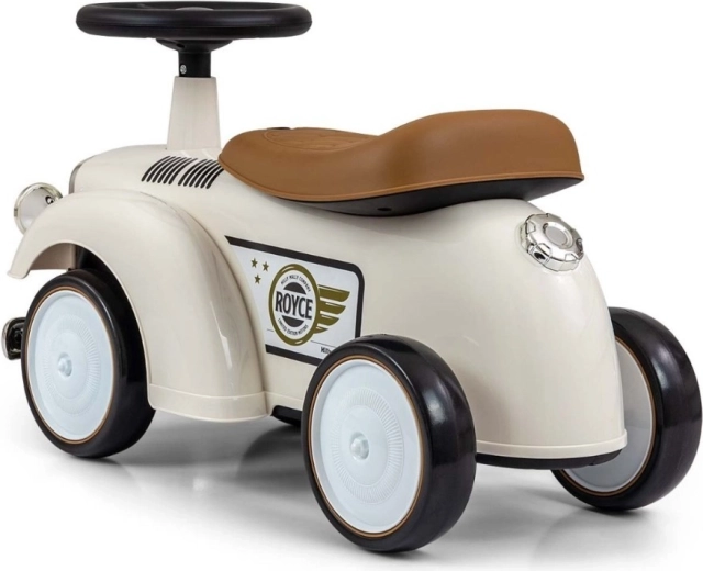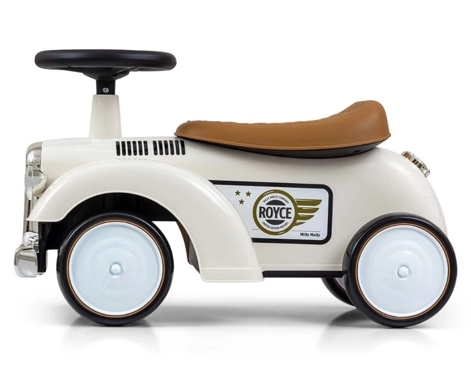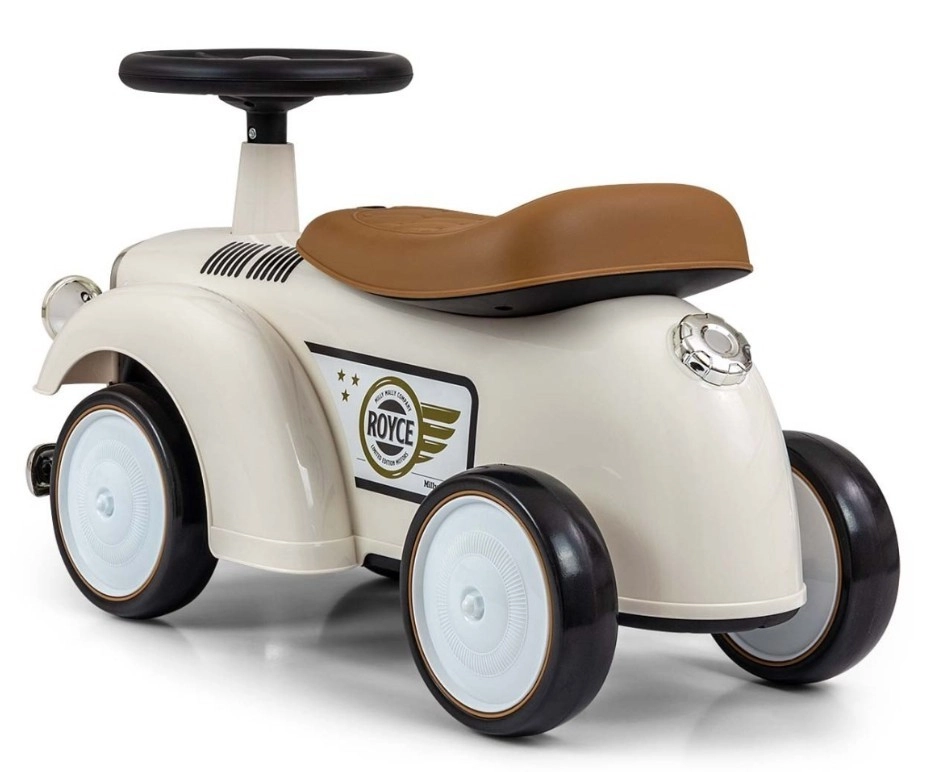 Lo spingidito Royce si distingue per il look vintage con dettagli cromati e l’emblema ROYCE, che gli conferiscono un carattere prestigioso. Grazie alle ruote larghe e stabili e alla seduta piacevolmente sagomata è ideale come primo veicolo per i bambini che sanno già sedere autonomamente. Il volante girevole consente di manovrare facilmente sia in casa sia durante le passeggiate.