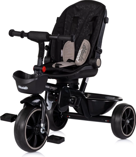 Per il massimo comfort il triciclo è dotato di morbida imbottitura tessile, cintura di sicurezza, poggiapiedi richiudibili e capienti cestini anteriori e posteriori. La maniglia parentale regolabile su due altezze permette una guida sicura e il controllo della direzione. La cappottina pieghevole con visiera parasole protegge dal sole e il portabibite può essere fissato in due posizioni.