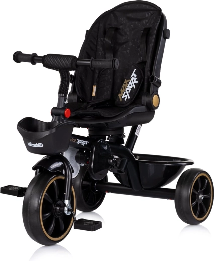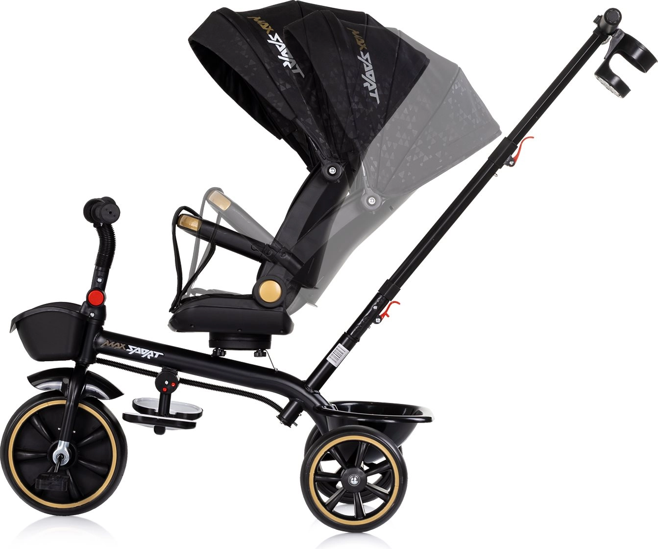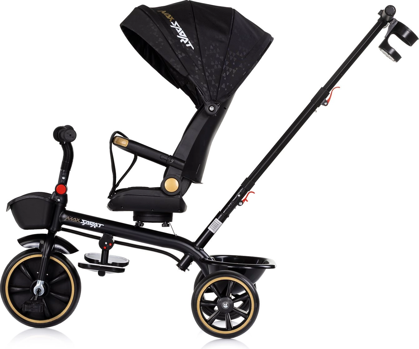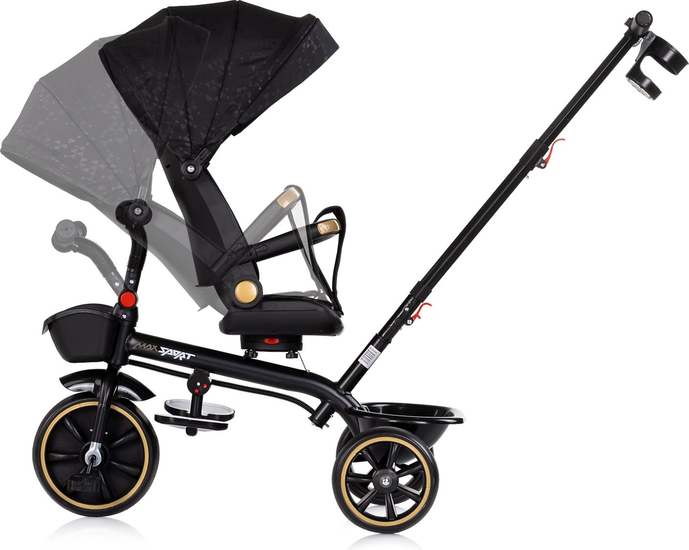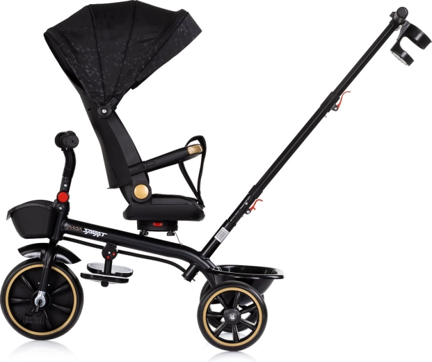 Il triciclo universale 2 in 1 per bambini CHIPOLINO Max Sport Noir cresce con il tuo bambino: dalla modalità con guida dei genitori fino alla guida autonoma. Offre un sedile girevole a 360°, schienale reclinabile, cappottina rimovibile con parasole, cintura di sicurezza e paraurti protettivo. Grazie al maniglione regolabile, ai poggiapiedi ribaltabili e ai cestini portaoggetti anteriori e posteriori è ideale per passeggiate comode e sicure.