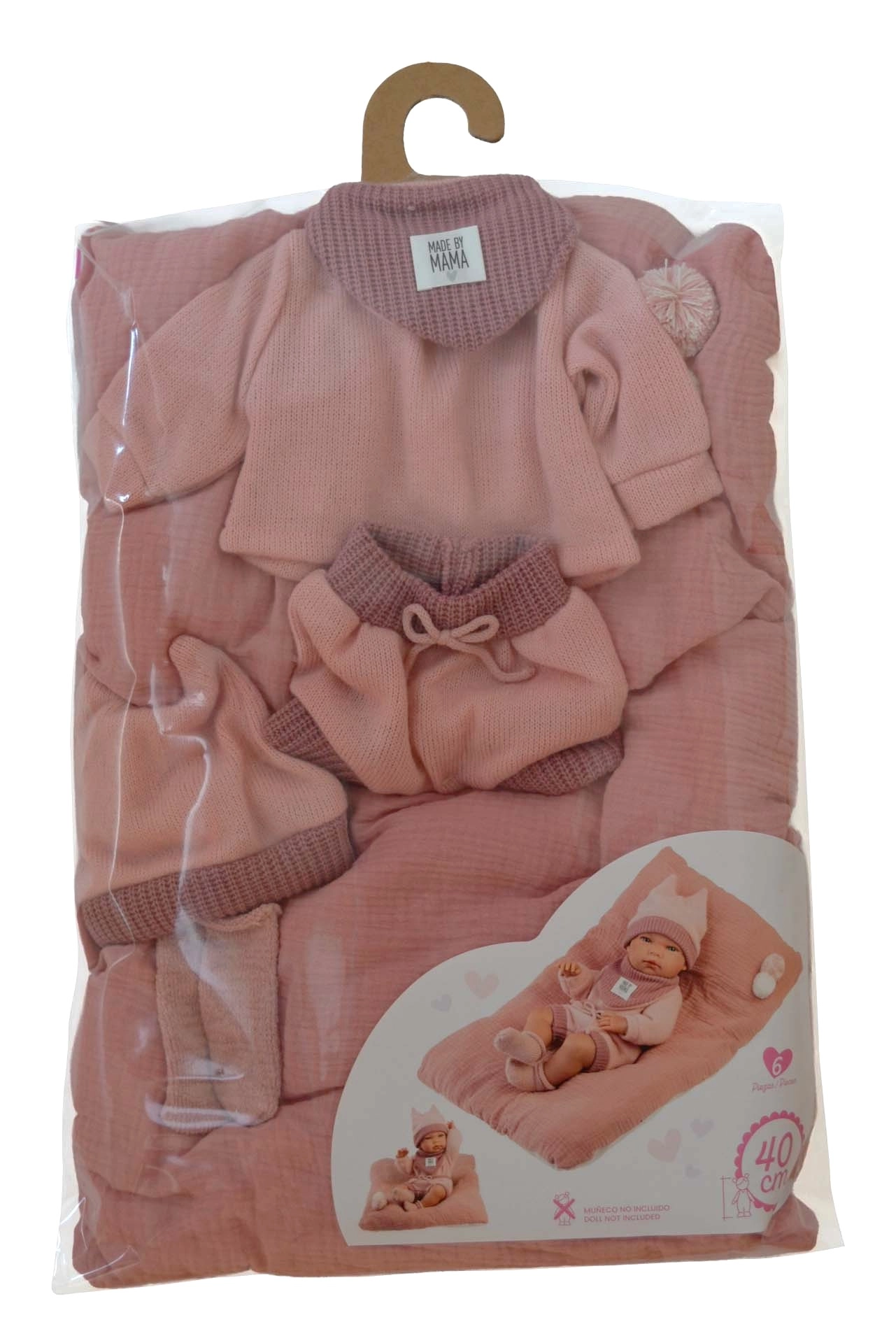 Quattro capi coordinati sono completati da un cuscino/tappetino decorativo che rende più accogliente la culletta e l’angolo gioco con la bambola.