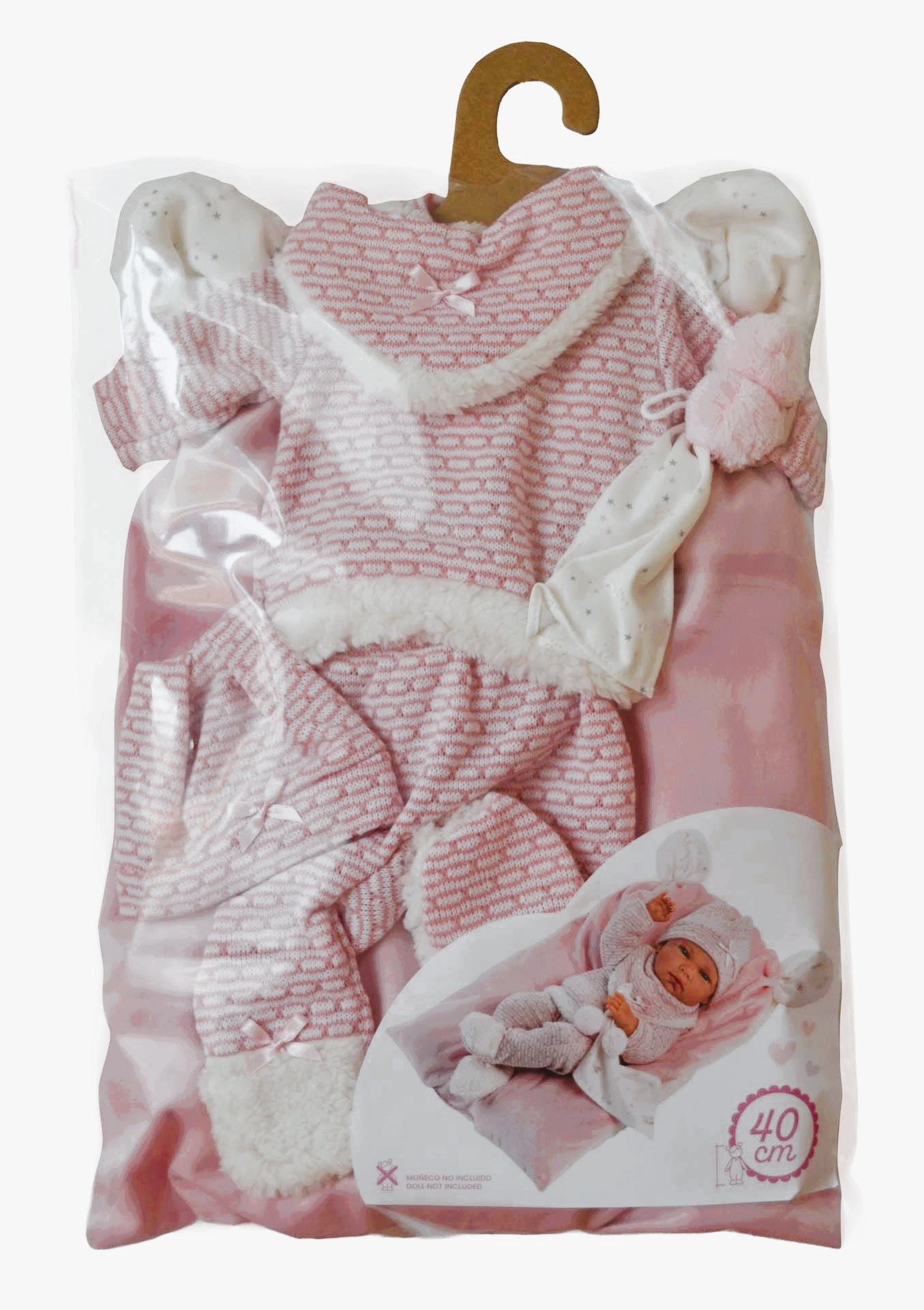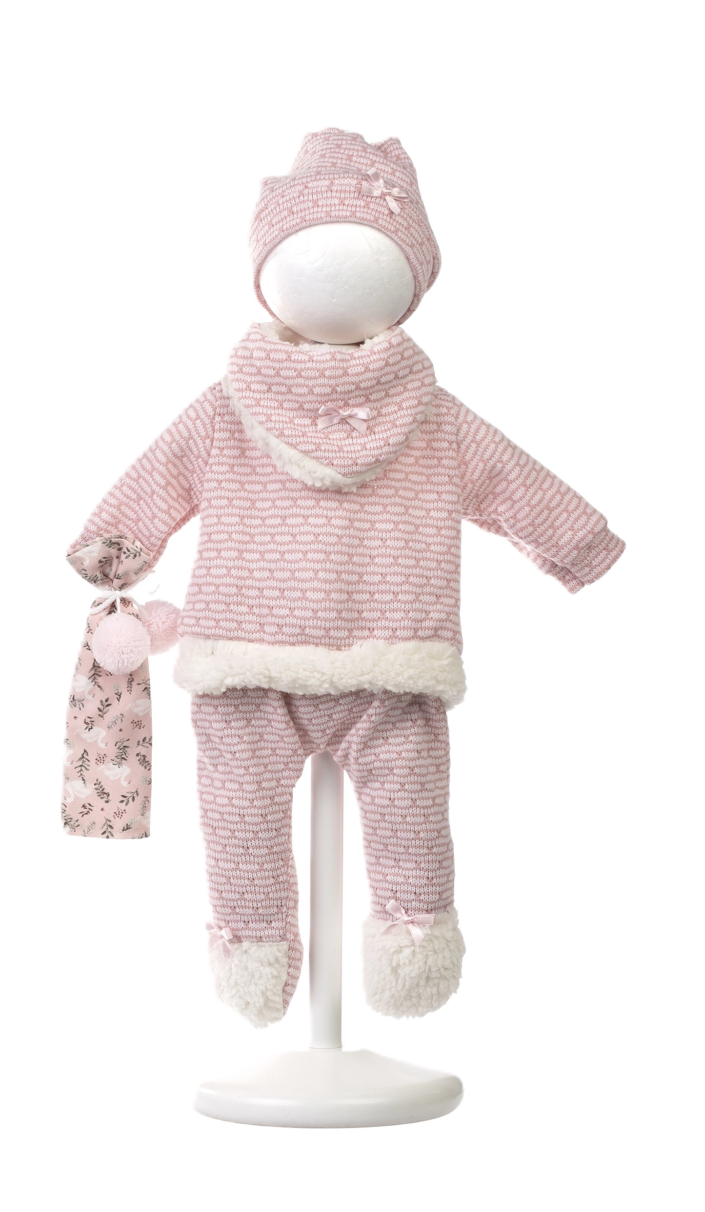 Il set comprende un top caldo, pantaloni, cappellino e scarpine con bordi soffici – ideali per vestire la bambola in inverno e per un gioco confortevole.