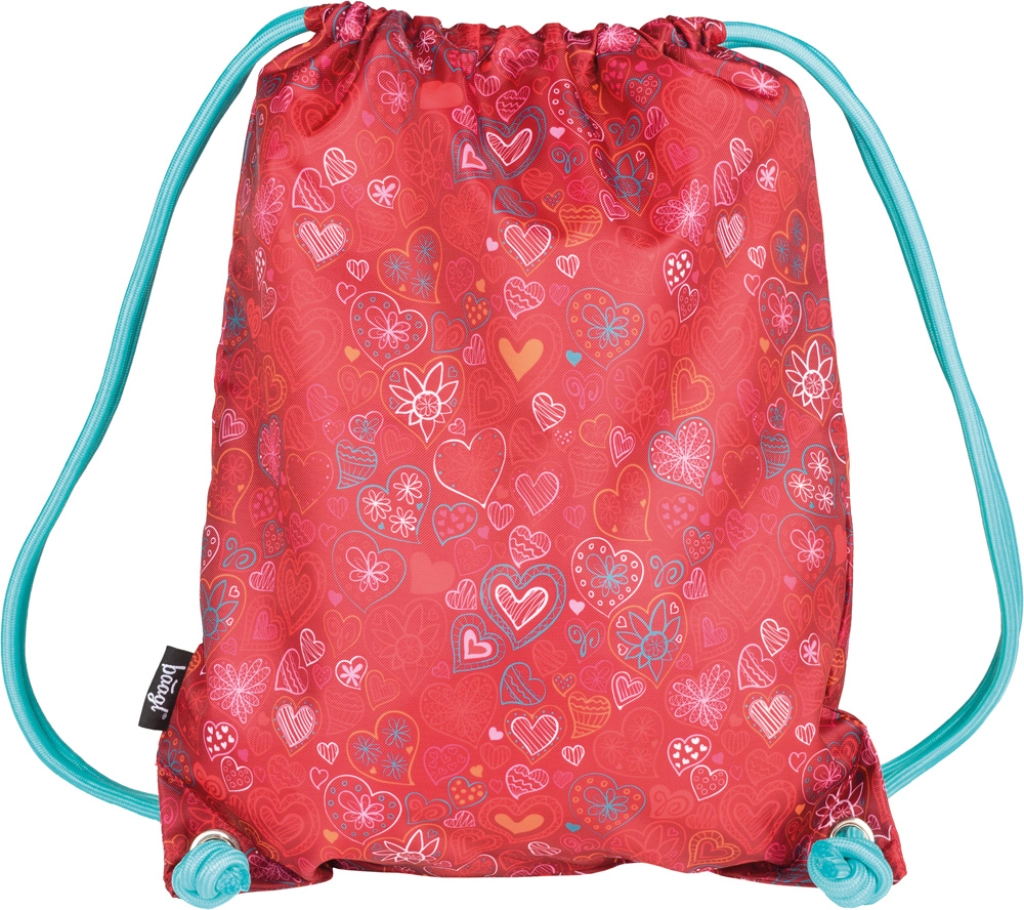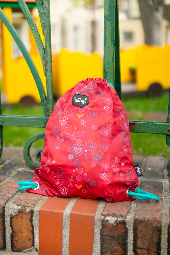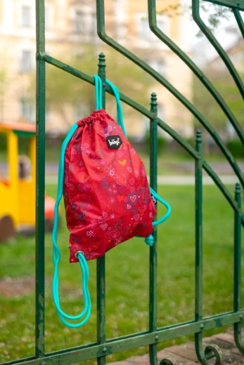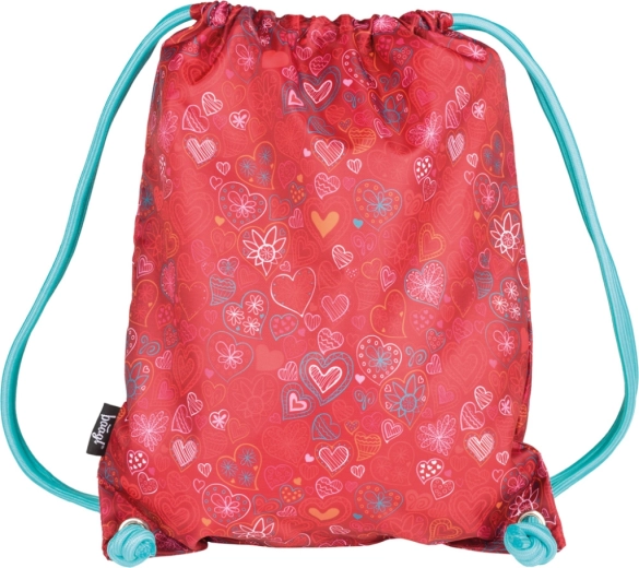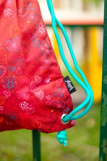 Sacca per ginnastica leggera e resistente con romantico motivo a cuori in colore rosso. Grazie alle robuste coulisse si chiude facilmente e si può portare sulla schiena come uno zaino. Realizzata in materiale resistente e lavabile, ideale per abbigliamento da ginnastica, pantofole e piccoli oggetti per la scuola o le attività extrascolastiche.
