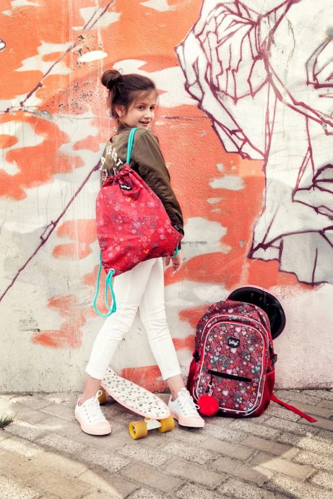 Il rosso intenso e il motivo a cuori piaceranno agli amanti dello stile giocoso e si abbinano al corredo scolastico.