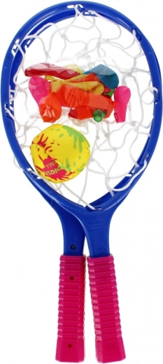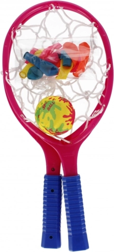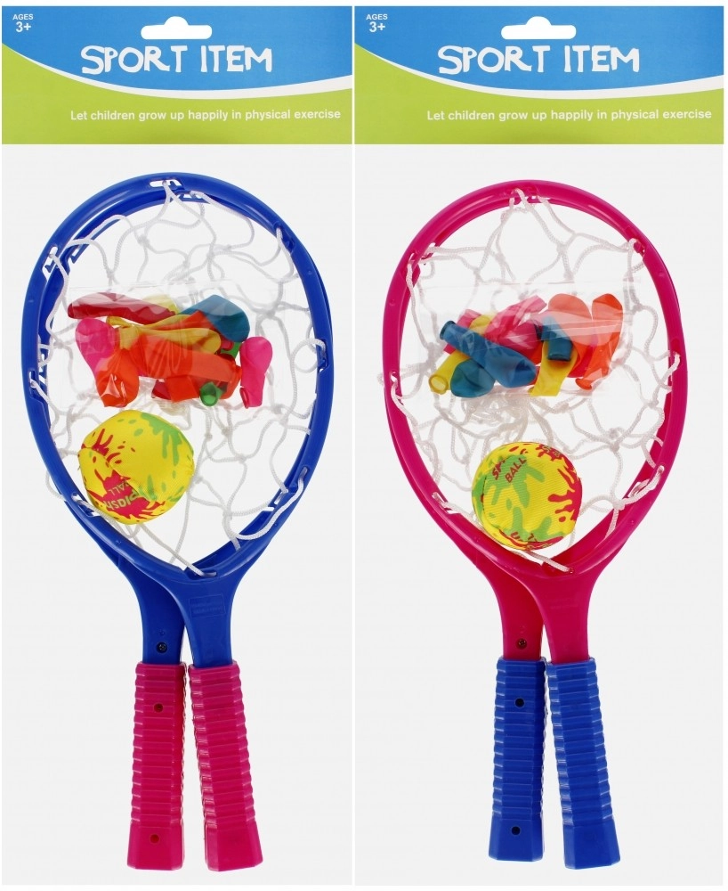 - 2 racchettoni in plastica con reticella, 1 pallina morbida, palloncini d’acqua (mix di colori)