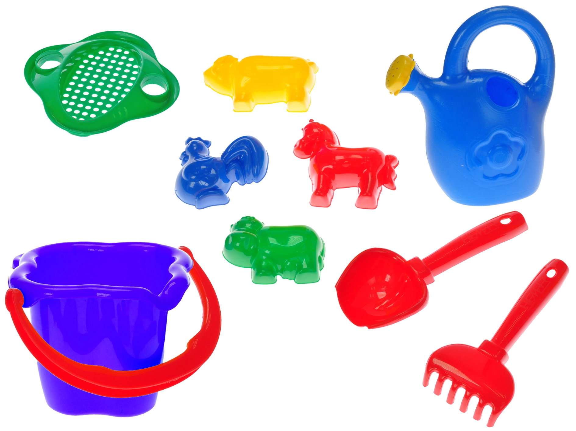 Secchiello con setaccio, annaffiatoio, paletta, rastrellino e formine animaletti: l’equipaggiamento completo per costruire castelli, setacciare la sabbia e annaffiare.