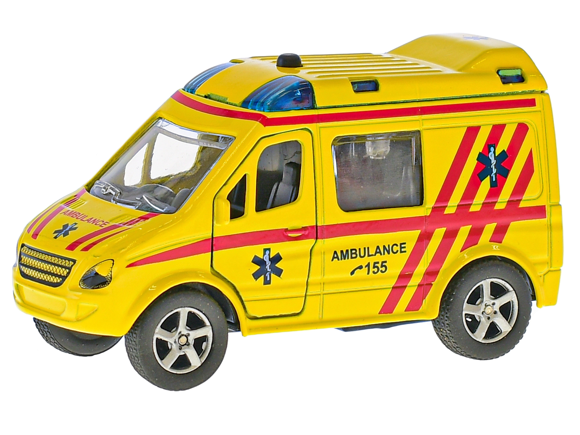 Sulla carrozzeria è ben visibile il numero di emergenza 155, che aiuta i bambini a ricordare a chi telefonare in caso di necessità. La costruzione in metallo garantisce maggiore resistenza e lunga durata, rendendo l’ambulanza adatta sia al gioco in casa che alle collezioni dei piccoli conducenti.
