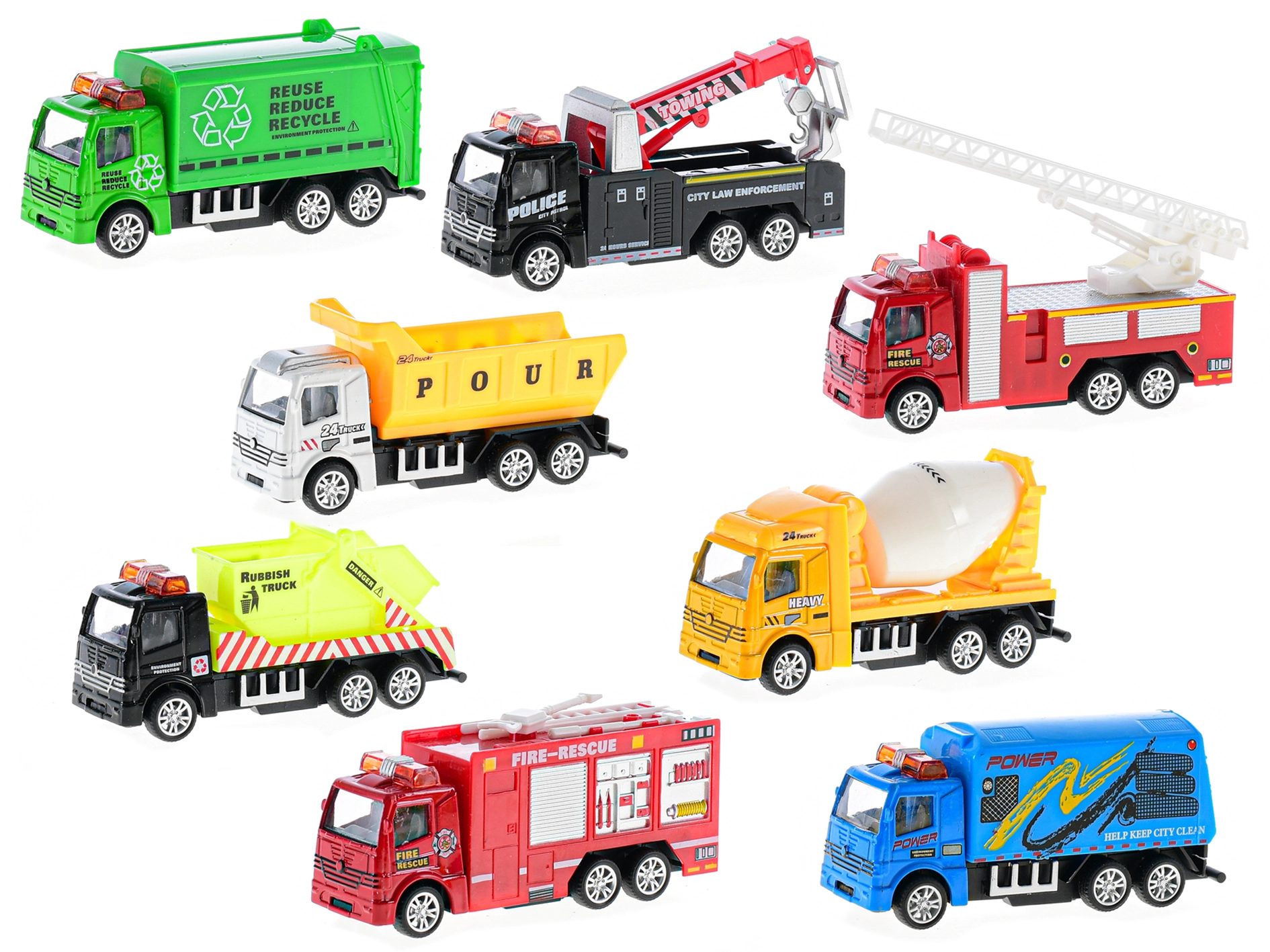 Scelta tra 8 tipi: camion della spazzatura, carro attrezzi, pompieri, ribaltabile, betoniera e spazzatrice stradale – ideale per creare la propria città.