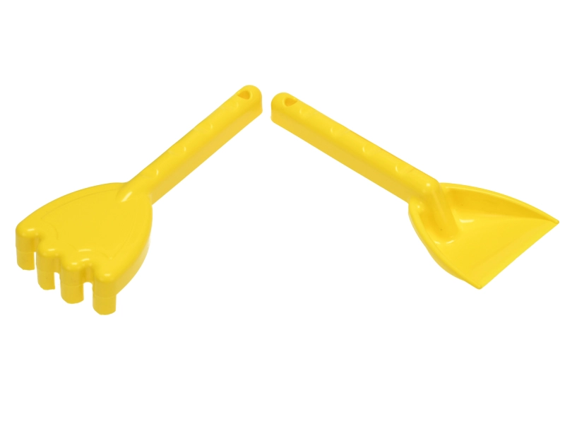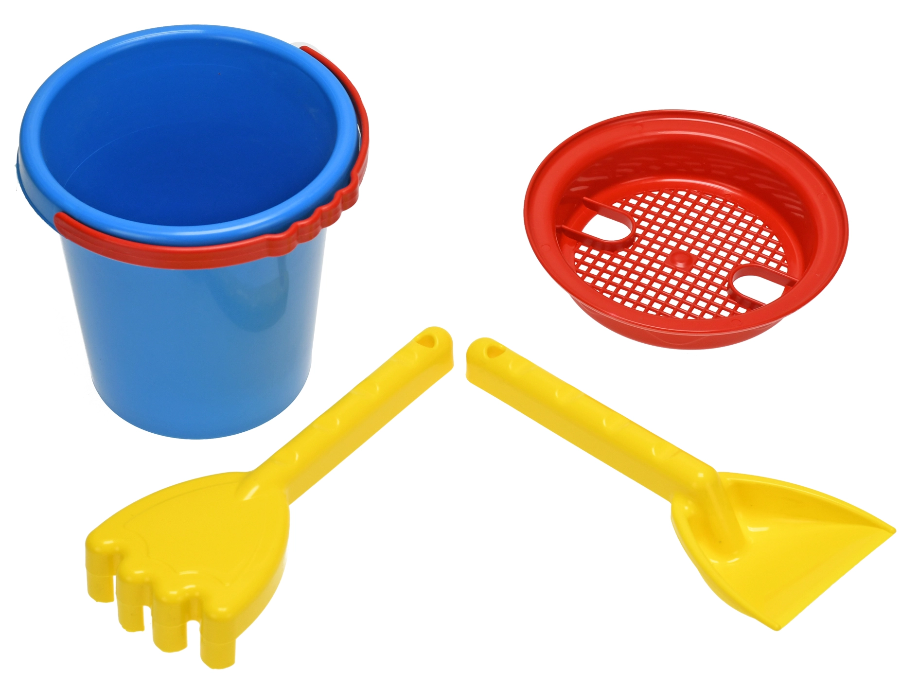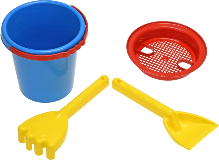 Secchiello, setaccio, paletta e rastrelli offrono un equipaggiamento completo per costruire formine, castelli e dighe nella sabbiera o in spiaggia.