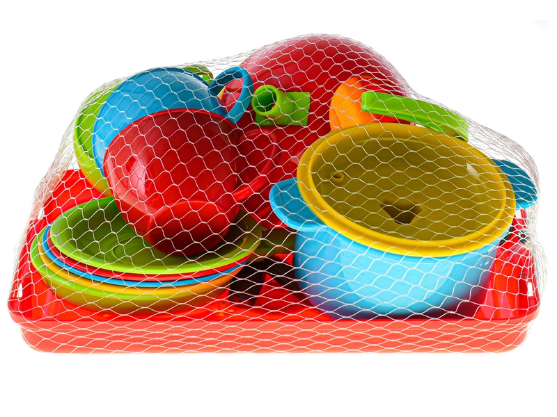 Questo set colorato per la cucina dei bambini offre tutto ciò di cui i piccoli cuochi hanno bisogno: fornello con due piastre e manopole girevoli, teiera, pentola con coperchio, padella e servizio completo di tazze con piattini e cucchiaini. Grazie alla plastica leggera e resistente, le stoviglie sono facili da maneggiare e ideali per il gioco quotidiano.