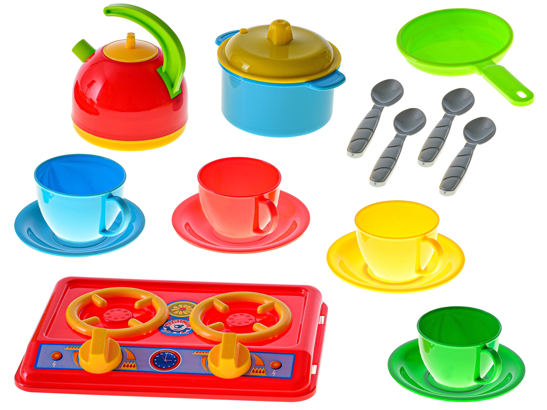 Fornello con due piastre, teiera, pentola con coperchio, padella e colorato set da tè stimolano il gioco creativo e il role-play.