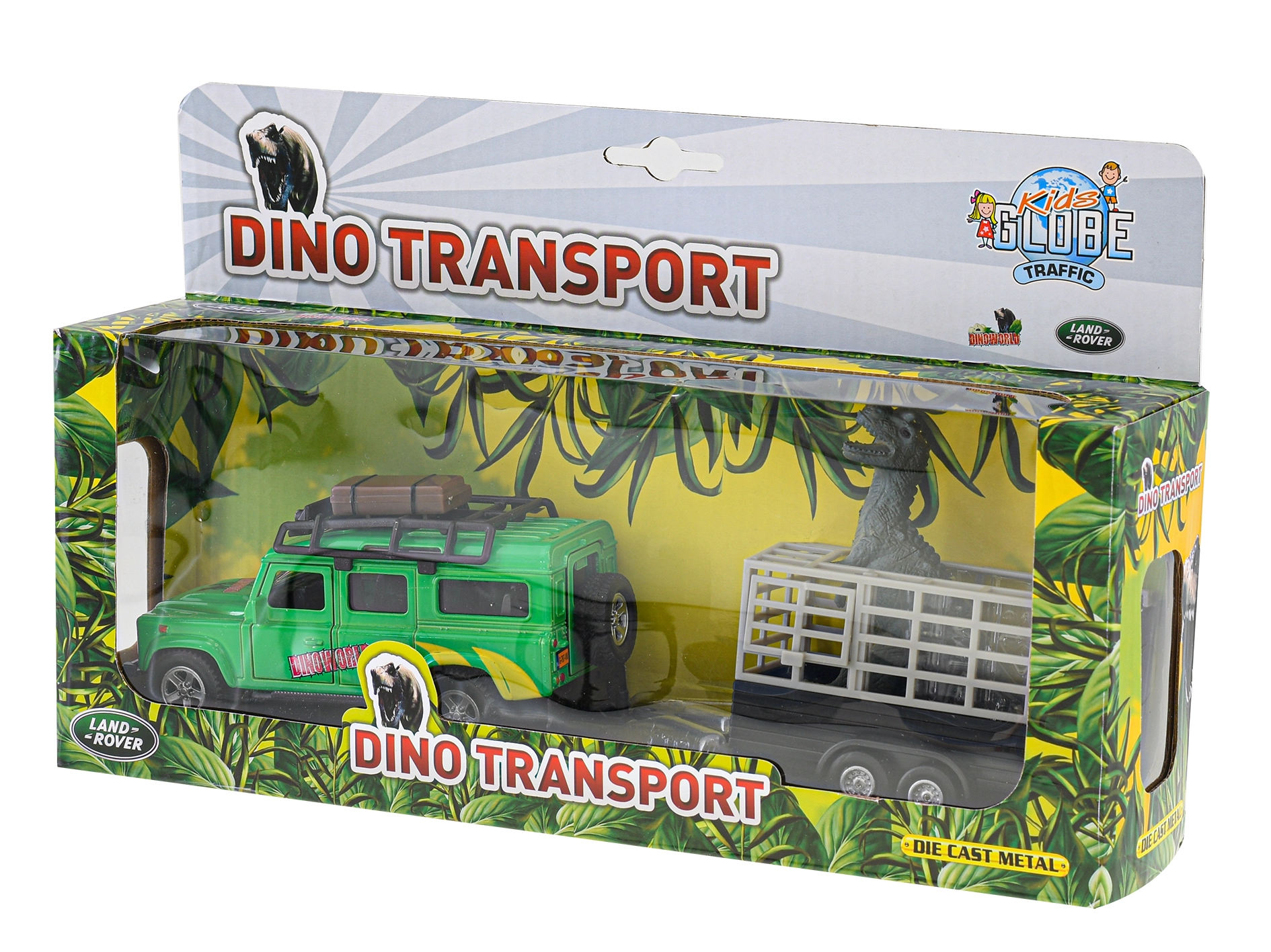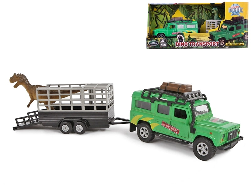 Parti per un'avventura con il fuoristrada Kids Globe Traffic! Modello in metallo LAND ROVER lungo 28 cm con retrocarica, porte anteriori apribili, vano sul tetto per l'equipaggiamento e rimorchio con gabbia e figurina di dinosauro – ideale per i bambini che amano le auto e il mondo preistorico.