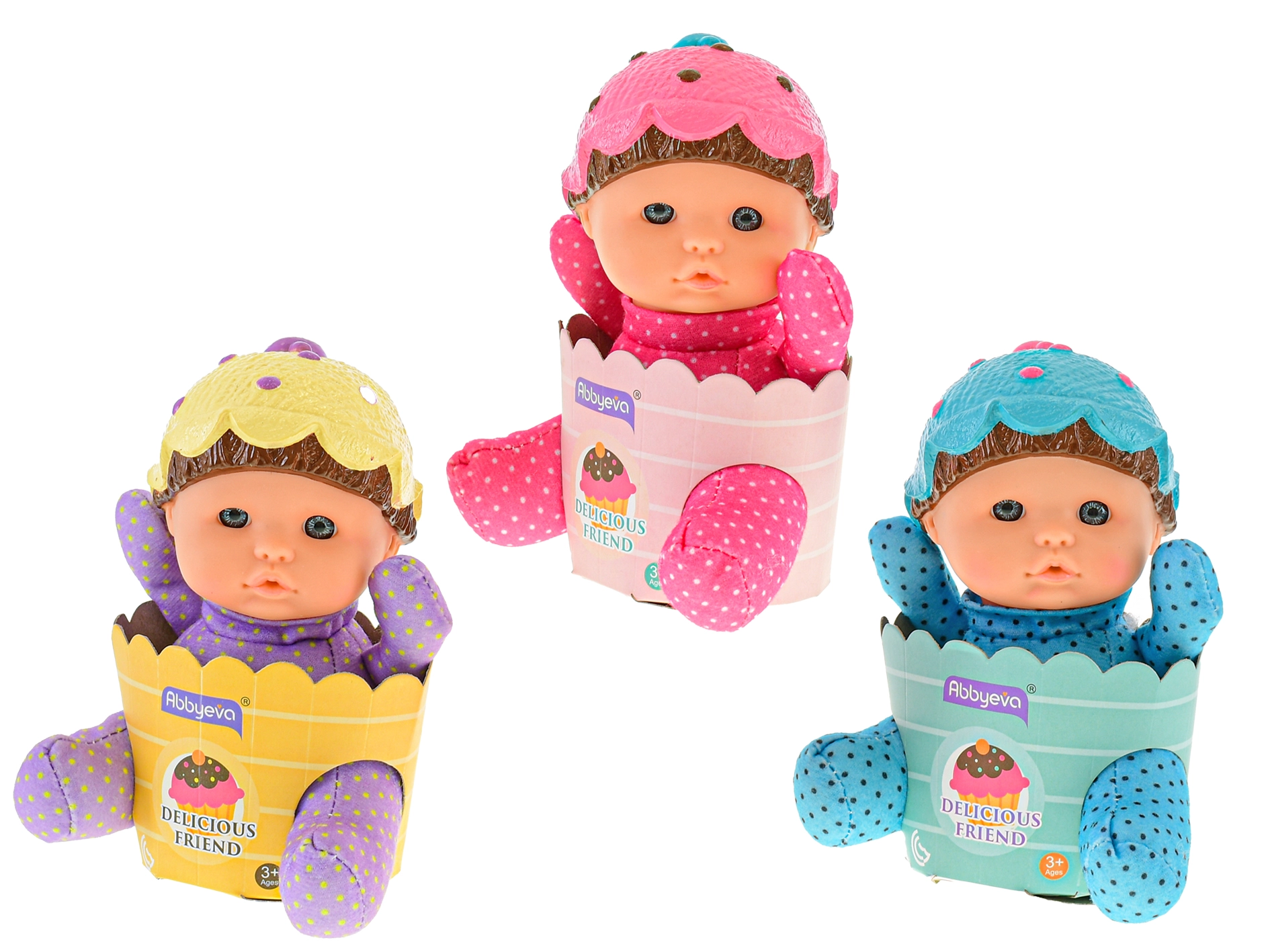 Versioni rosa, azzurra e viola con pois e cuffietta a cupcake incoraggiano la collezione e lo scambio tra bambini.