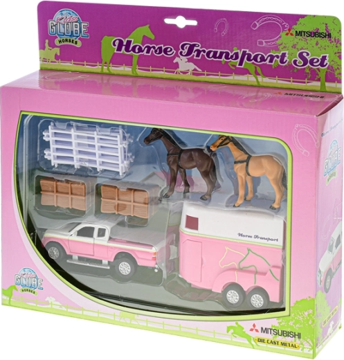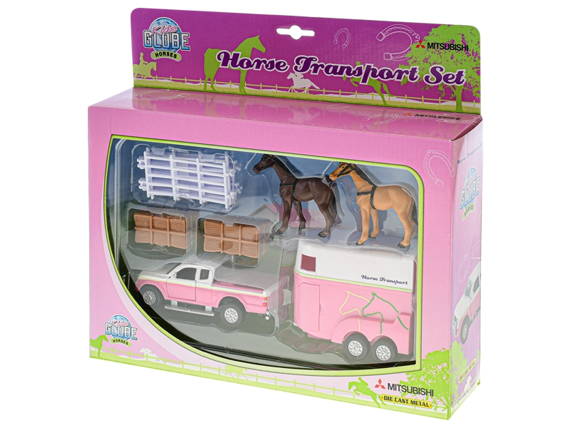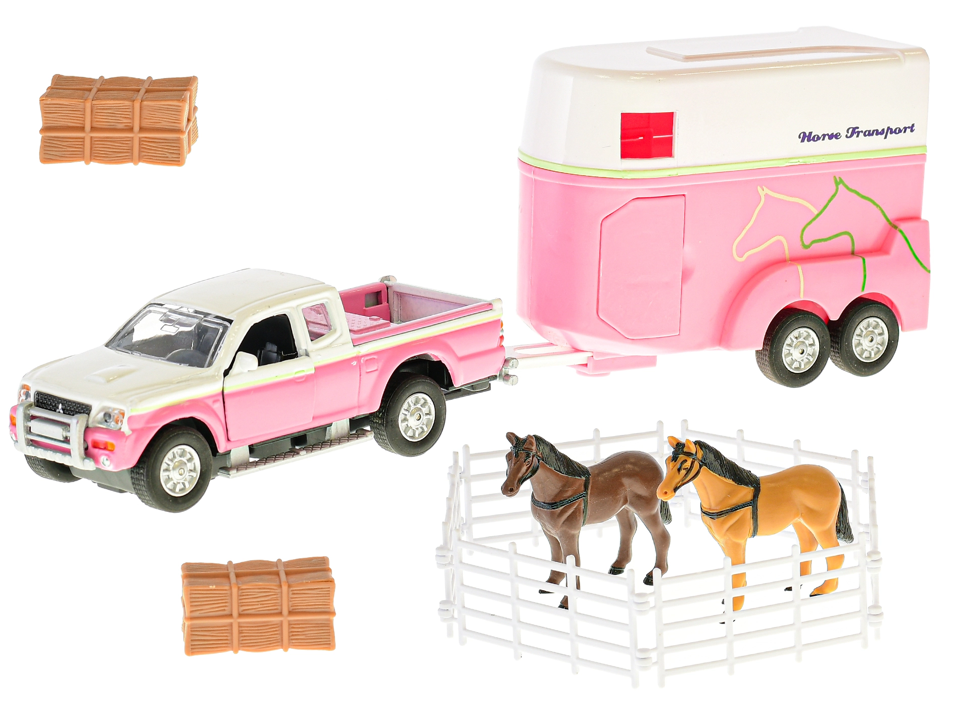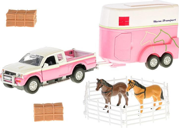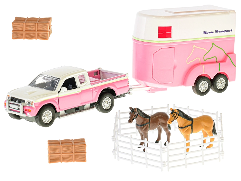 Scopri un divertente set per i piccoli amanti dei cavalli: fuoristrada con rimorchio in scala 1:32 e ricchi accessori. Il modello in metallo lungo 13 cm vanta la funzione di retrocarica, un rimorchio con rampa apribile e porte laterali e accessori per un gioco creativo da fattoria – due cavalli, balle di fieno e recinto.
